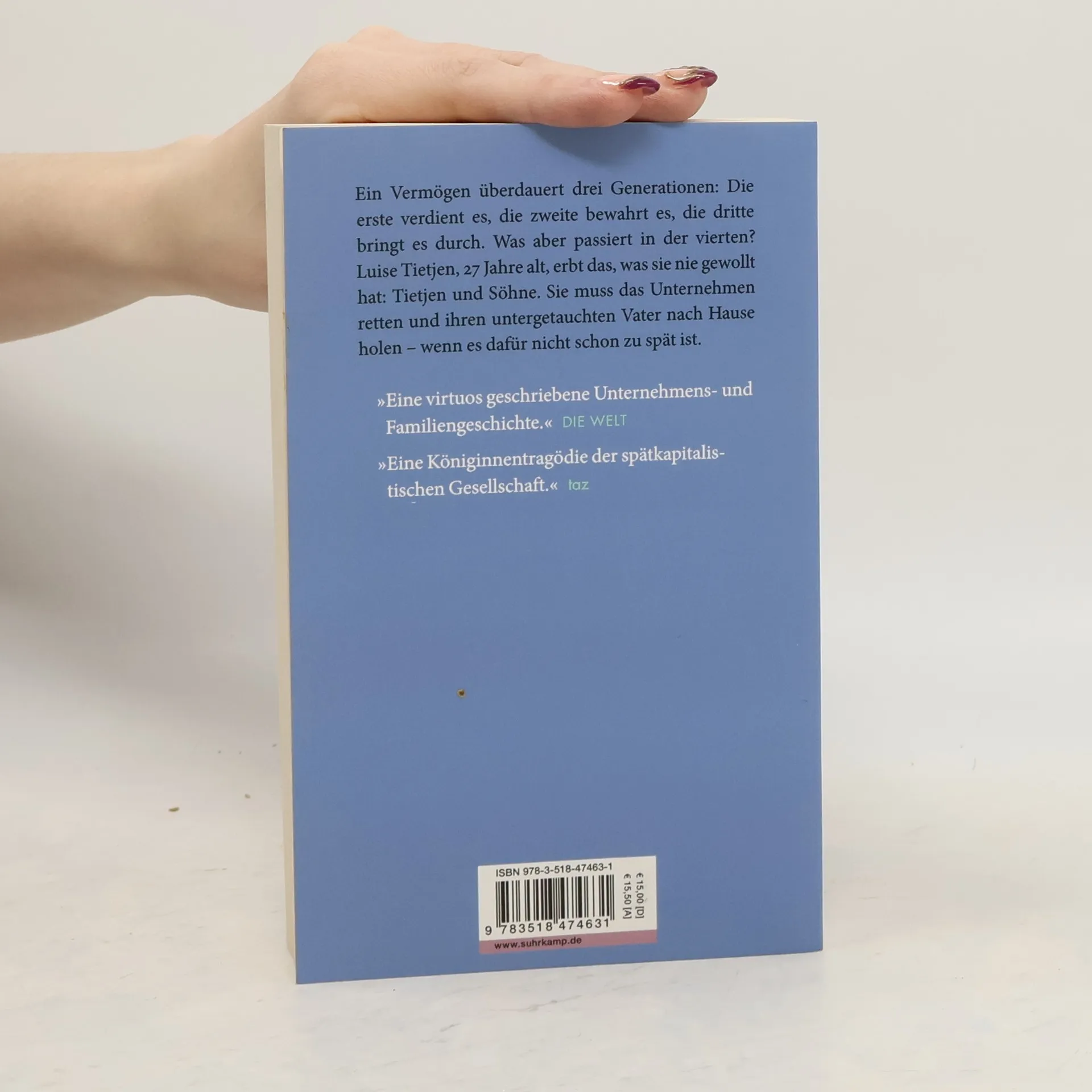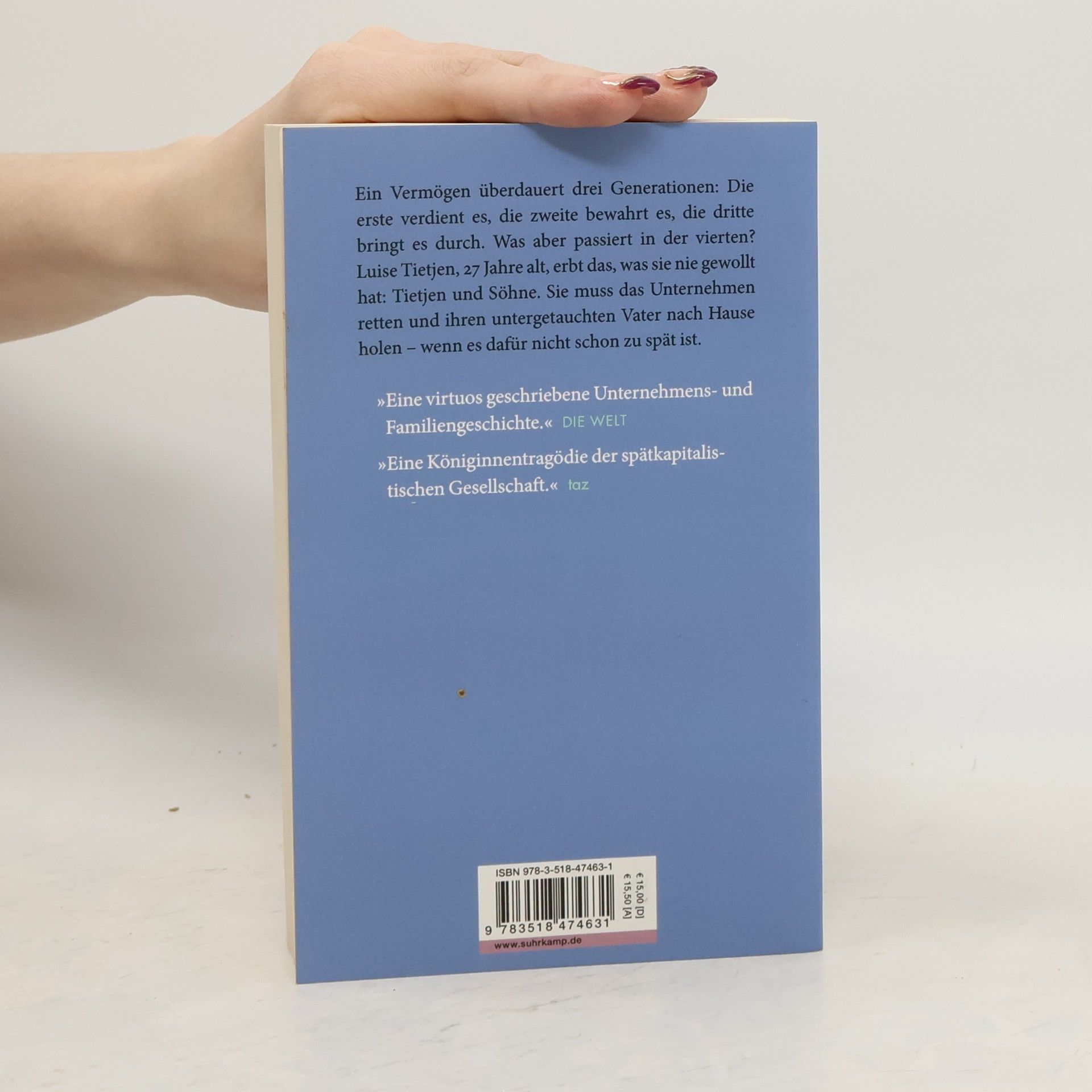 Nora Bossong schildert in ihrem Roman den Aufstieg und Fall eines Familienunternehmens über Generationen. Luise Tietjen, 27, erbt die rückläufige Firma Tietjen und Söhne und kämpft darum, sie zu retten und ihren verschwundenen Vater zurückzuholen. Doch die Zeit drängt.