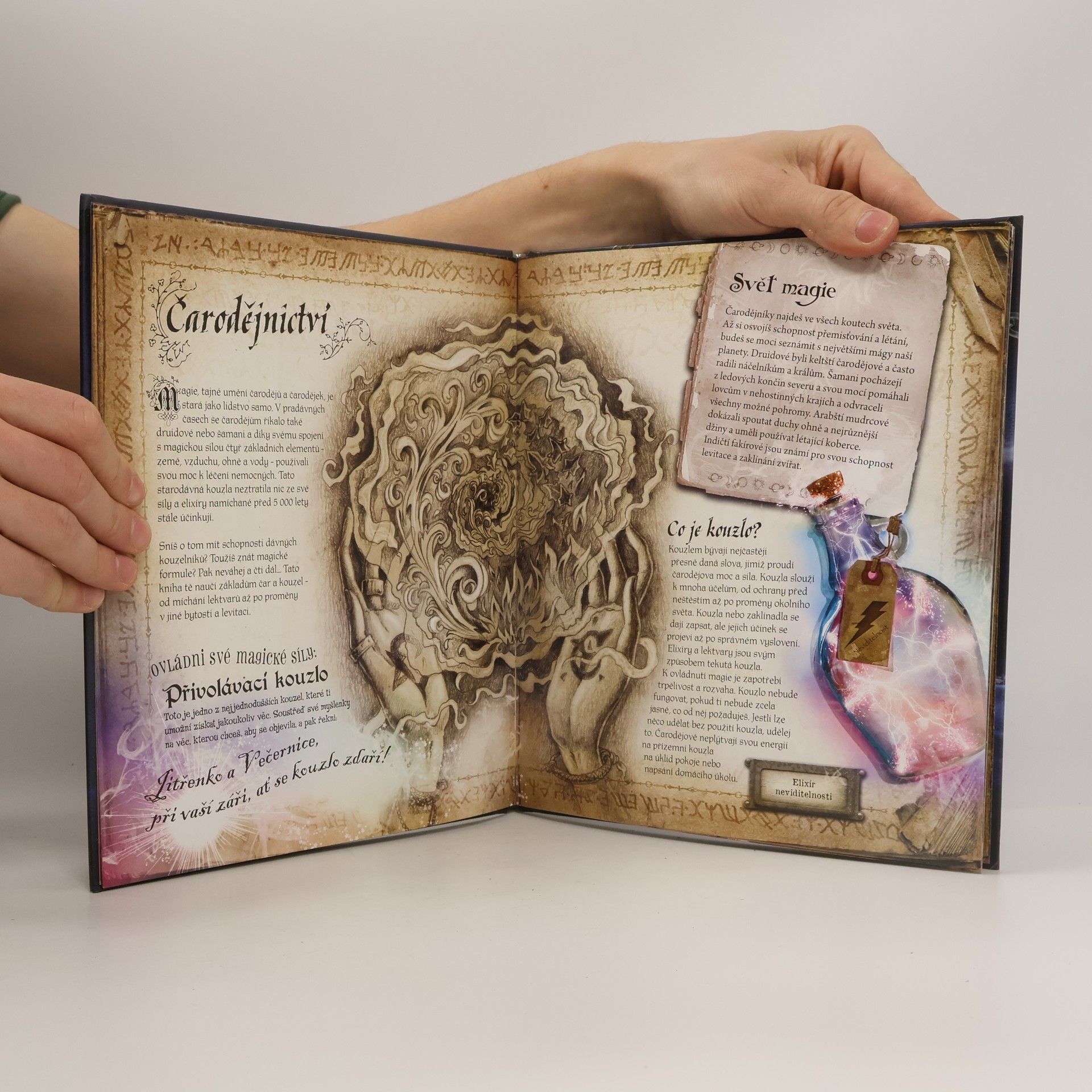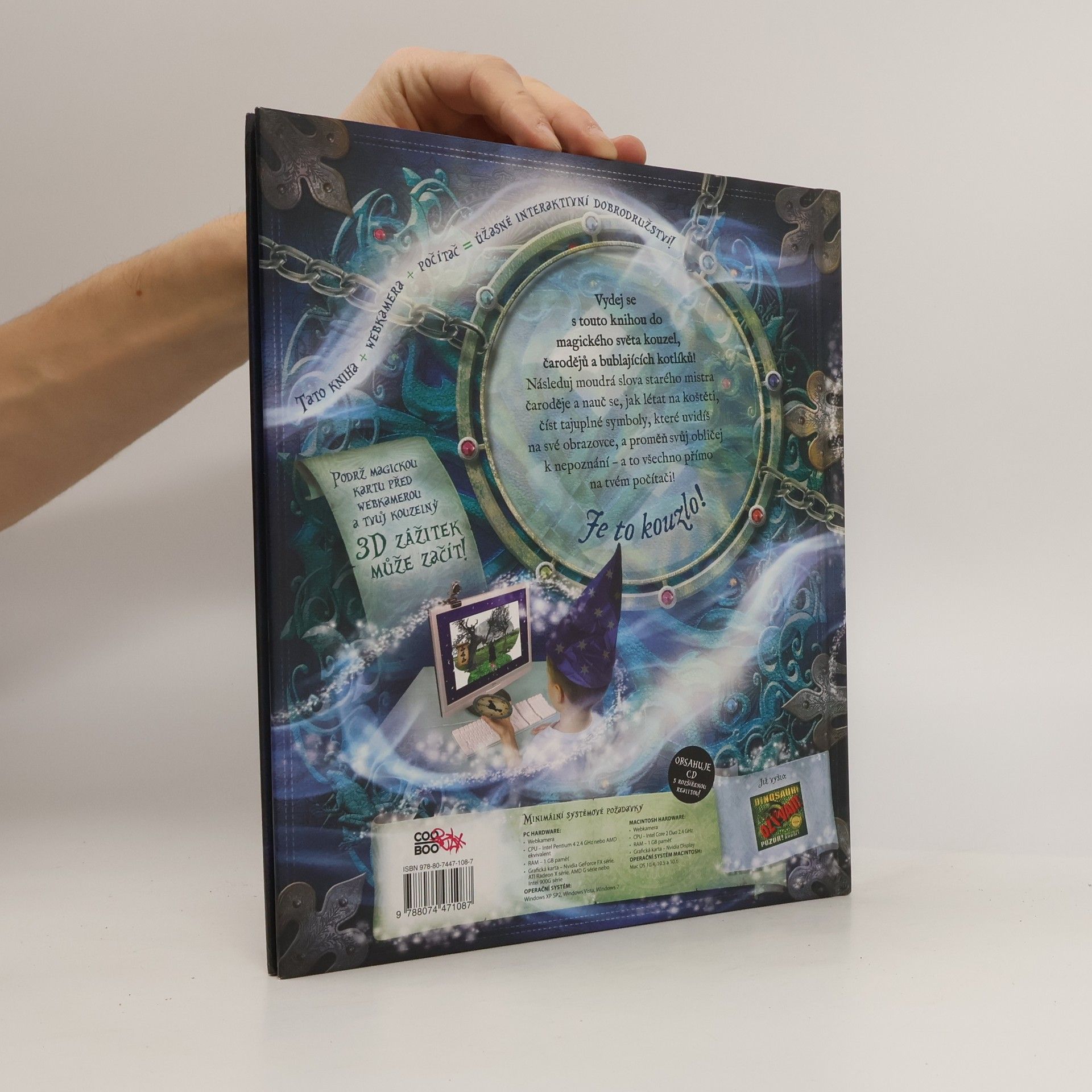 Kniha plná magie! Vydej se s touto knihou do magického světa kouzel, čarodějů a bublajících kotlíků! Nauč se, jak létat na koštěti, číst tajuplné symboly a proměnit svůj obličej k nepoznání – a to všechno nejen díky pradávným zaříkadlům a lektvarům, ale i díky magickým kartám, které tě přímo na tvém počítači přenesou do kouzelného světa!