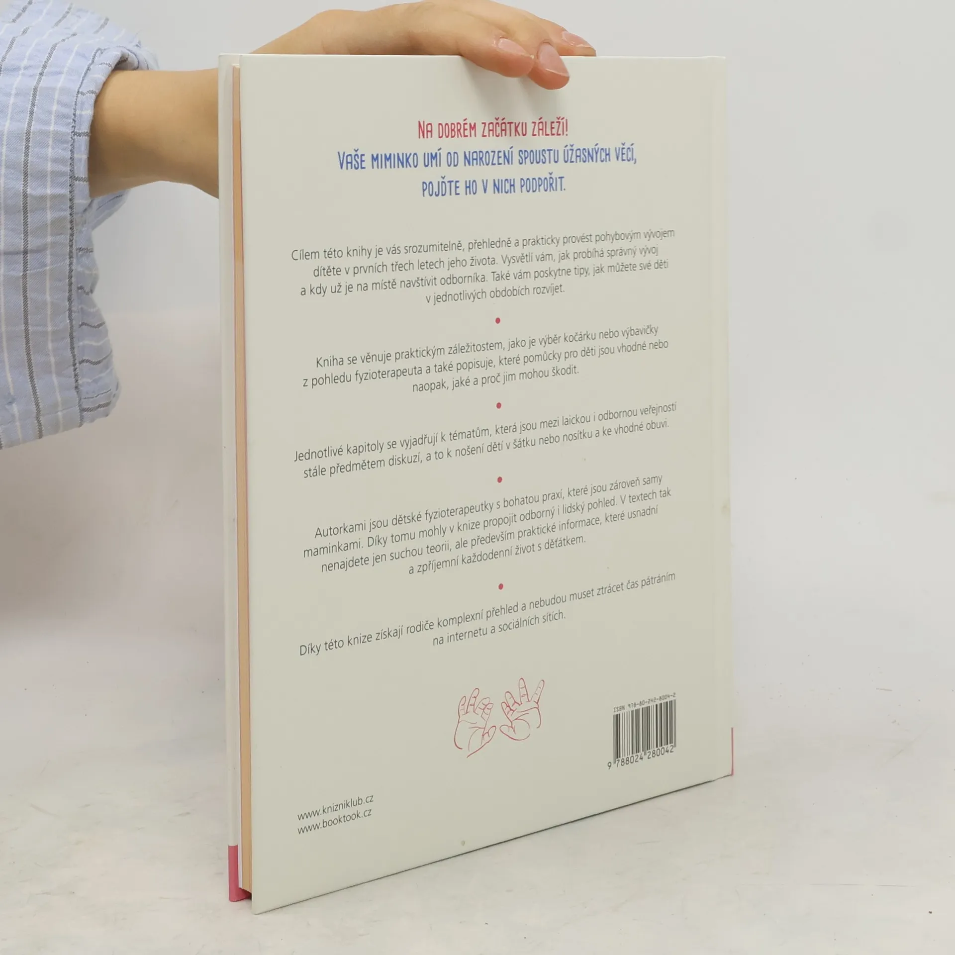 Na dobrém začátku záleží! Cílem této knihy, sepsané dvěma fyzioterapeutkami a zároveň maminkami malých dětí, je srozumitelně, přehledně a prakticky provést rodiče pohybovým vývojem jejich děťátka v prvních třech letech života. Vysvětluje, co je dobré sledovat a proč, kdy už je vhodné navštívit odborníka, i to, jak mohou rodiče své děti v jednotlivých obdobích rozvíjet. Publikace zároveň usnadňuje orientaci v často nepřeberném množství dětských pomůcek, které dnešní trh nabízí, včetně pomoci s výběrem správného kočárku či nosítka a později i vhodné obuvi.