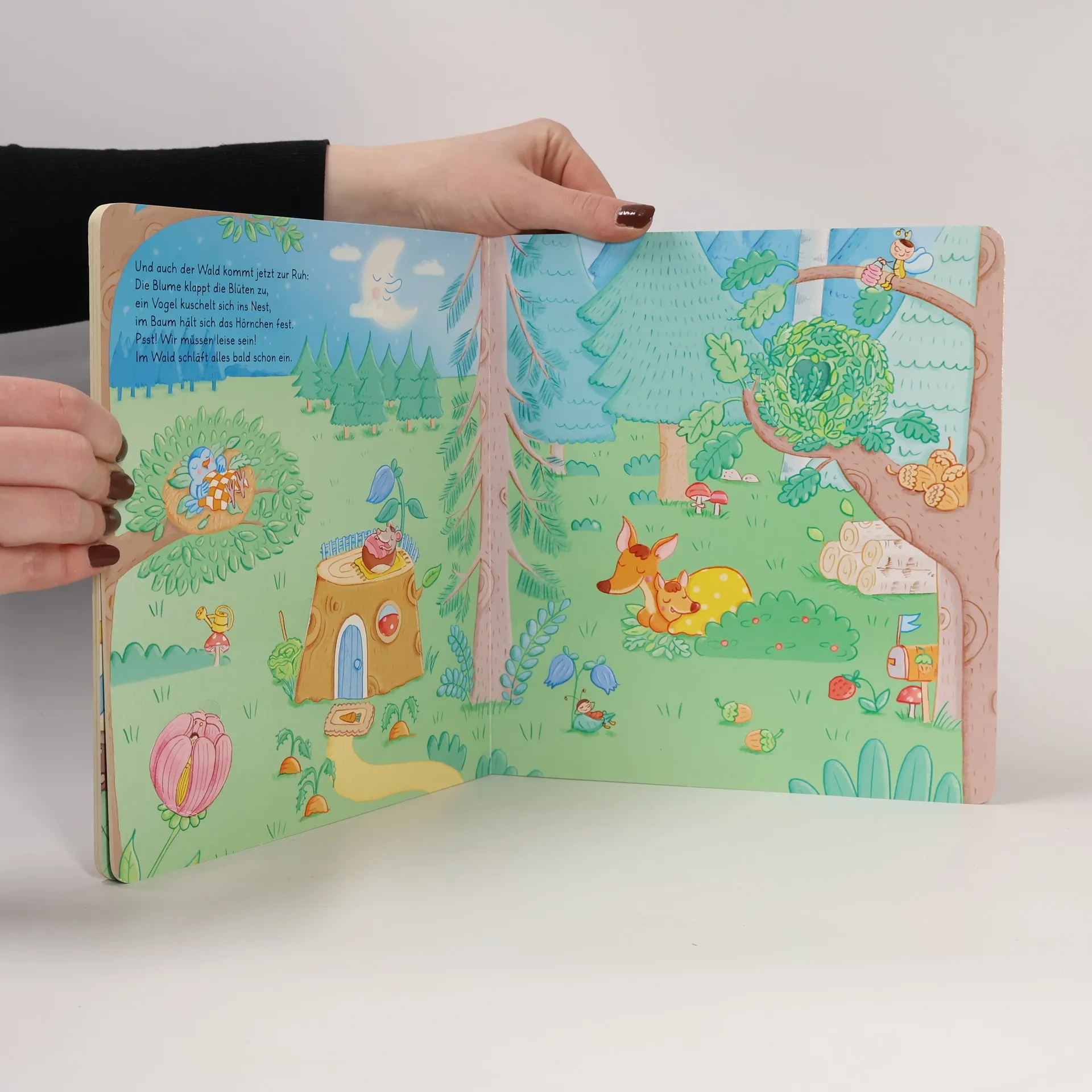 Ein bezauberndes Pappbilderbuch mit Reimen und Klappen, in dem Tiere, Fahrzeuge und die Stadt zur Nachtruhe gebeten werden. Sanfte Szenen zeigen, wie alle, auch die Kinder, friedlich einschlafen.