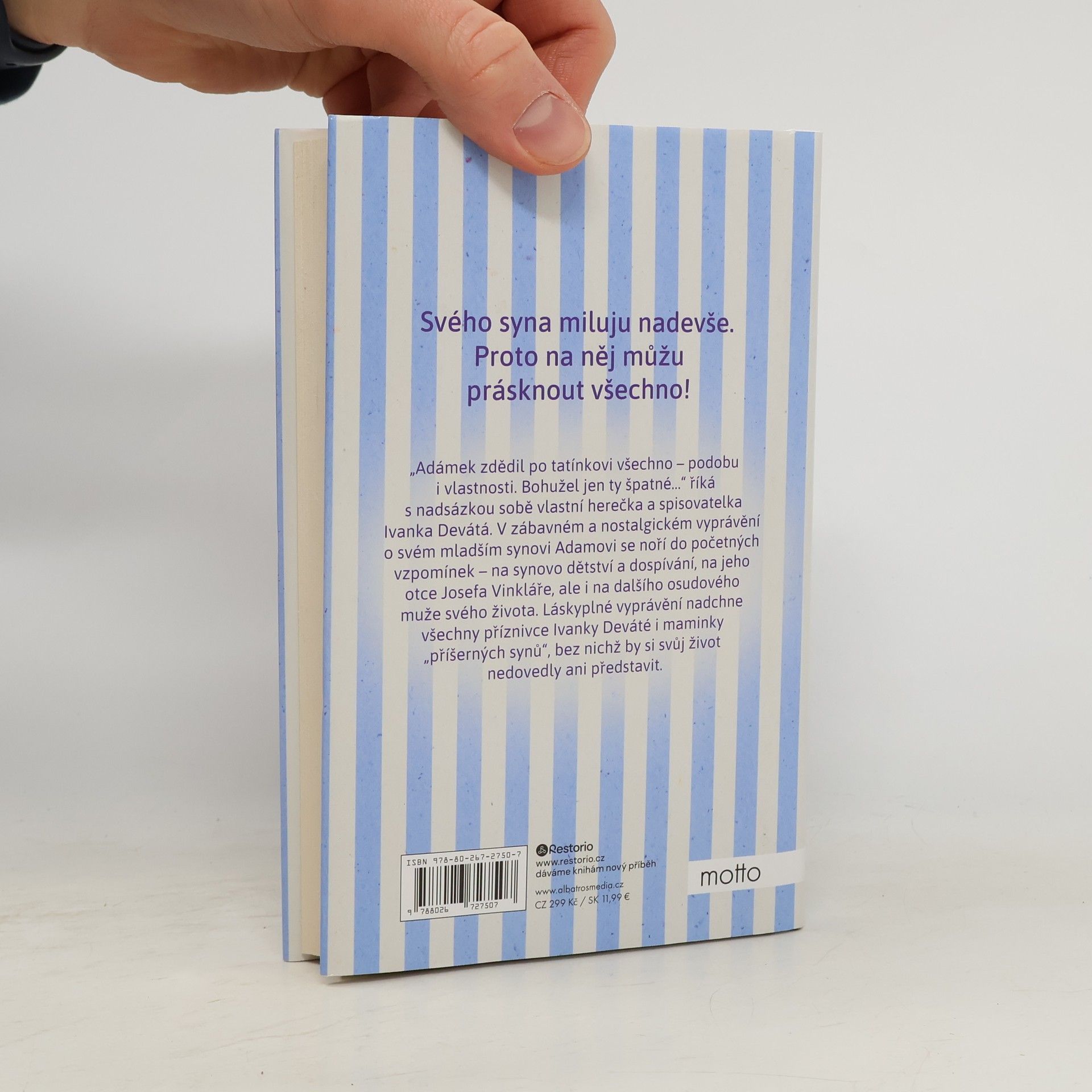 Humorné i nostalgické vyprávění české herečky, ve kterém s jemnou ironií sobě vlastní vzpomíná na výchovu mladšího synka. "Adámek zdědil po tatínkovi všechno - podobu i vlastnosti. Bohužel jen ty špatné," říká s nadsázkou sobě vlastní herečka a spisovatelka Ivanka Devátá. V zábavném a nostalgickém vyprávění o svém mladším synovi Adamovi se noří do početných vzpomínek - na synovo dětství a dospívání, na jeho otce Josefa Vinkláře, ale i na dalšího osudového muže svého života. Nakladatelská anotace.