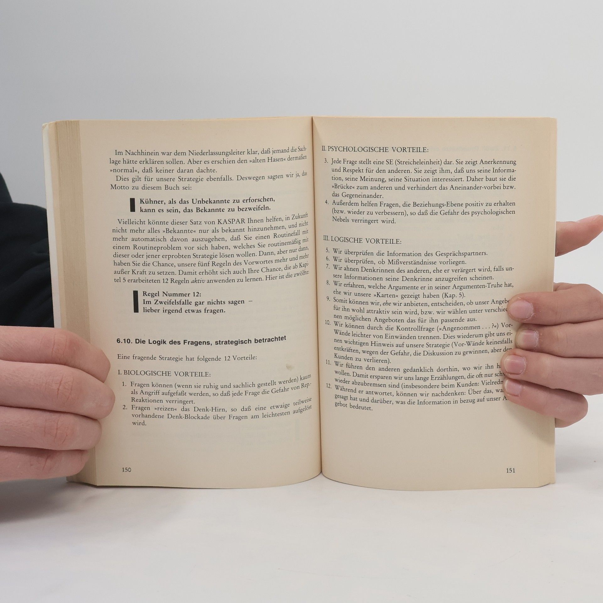 Ob es sich um eine Dienstleistung, ein Produkt oder die eigene Meinung handelt, die man verkaufen will - aus strategischer Sicht ist der Vorgang immer gleich. Vera F. Birkenbihl zeigt, worauf es ankommt und wie man erfolgreich verhandelt.Dazu hat sie ein eigenes Konzept der Bio-Logik, Psycho-Logik und Logik entwickelt, indem sie eindrucksvoll darstellt, warum zuerst die bio-logischen und psycho-logischen Aspekte berücksichtigt werden, bevor man sich dann logischen Fakten, Gründe und Tatsachen zuwenden kann. Wie man erfolgreich verhandelt, zeigt dieses Buch, das auf der Basis der jahrelangen Seminararbeit der Autorin basiert. Ein Buch für alle, die immer überzeugen wollen.