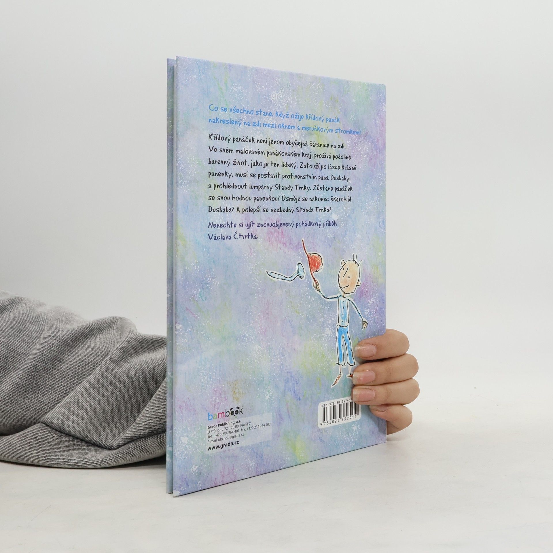 Obrázky mají velkou moc, a obzvlášť ty dětské. Přesvědčte se o tom ve znovuobjeveném pohádkovém příběhu Václava Čtvrtka. Co se všechno stane, když ožije křídový panák nakreslený na zdi mezi oknem a meruňkovým stromkem? Legendární tvůrce Rumcajse nebo Křemílka a Vochomůrky v půvabné knížce o oživlé malůvce na zdi odhaluje neviditelná kouzla ukrytá v dětské kresbičce. Kniha vychází u příležitosti autorova 105. výročí narození a 40. výročí úmrtí. Křídový panáček se narodil na jedné staré domovní zdi. Namaloval ho tam rošťák Standa Trnka. Kreslený panáček ale není jen tak obyčejnou čáranicí na zdi. Díky barevným křídám a jejich kouzelným čárám ožil, naučil se mluvit a zatoužil po podobném světě, jako je ten lidský, a tak panáček najde krásnou panenku, potká se se zlobou škarohlída Dusbaby i s lumpárnami nezbedného Standy. Usměje se nakonec pan Dusbaba? Polepší se Standa Trnka? A zůstane panáček se svou hodnou panenkou? Nechte se pozvat do kouzelného vyprávění Václava Čtvrtka.