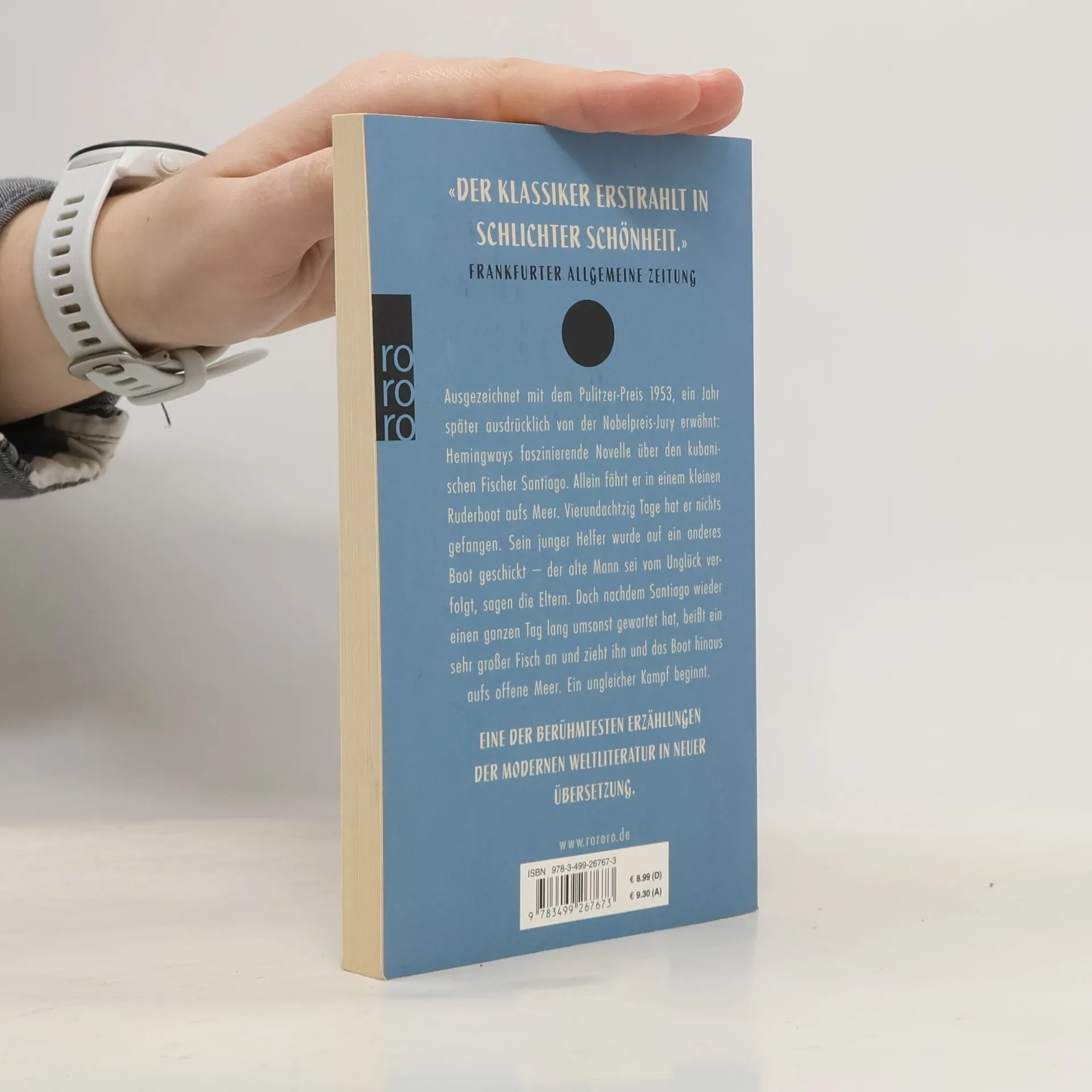 Ausgezeichnet mit dem Pulitzer-Preis 1953, ein Jahr später ausdrücklich von der Nobelpreis-Jury erwähnt: Hemingways faszinierende Novelle über den kubanischen Fischer Santiago. Allein fährt der in einem kleinen Ruderboot aufs Meer. Vierundachtzig Tage hat er nichts gefangen. Sein junger Helfer wurde auf ein anderes Boot geschickt – der alte Mann sei vom Unglück verfolgt, sagen die Eltern. Doch nachdem Santiago wieder einen ganzen Tag lang umsonst gewartet hat, beißt ein sehr großer Fisch an und zieht ihn und das Boot hinaus aufs offene Meer. Ein ungleicher Kampf beginnt. Eine der berühmtesten Erzählungen der modernen Weltliteratur in neuer Übersetzung.