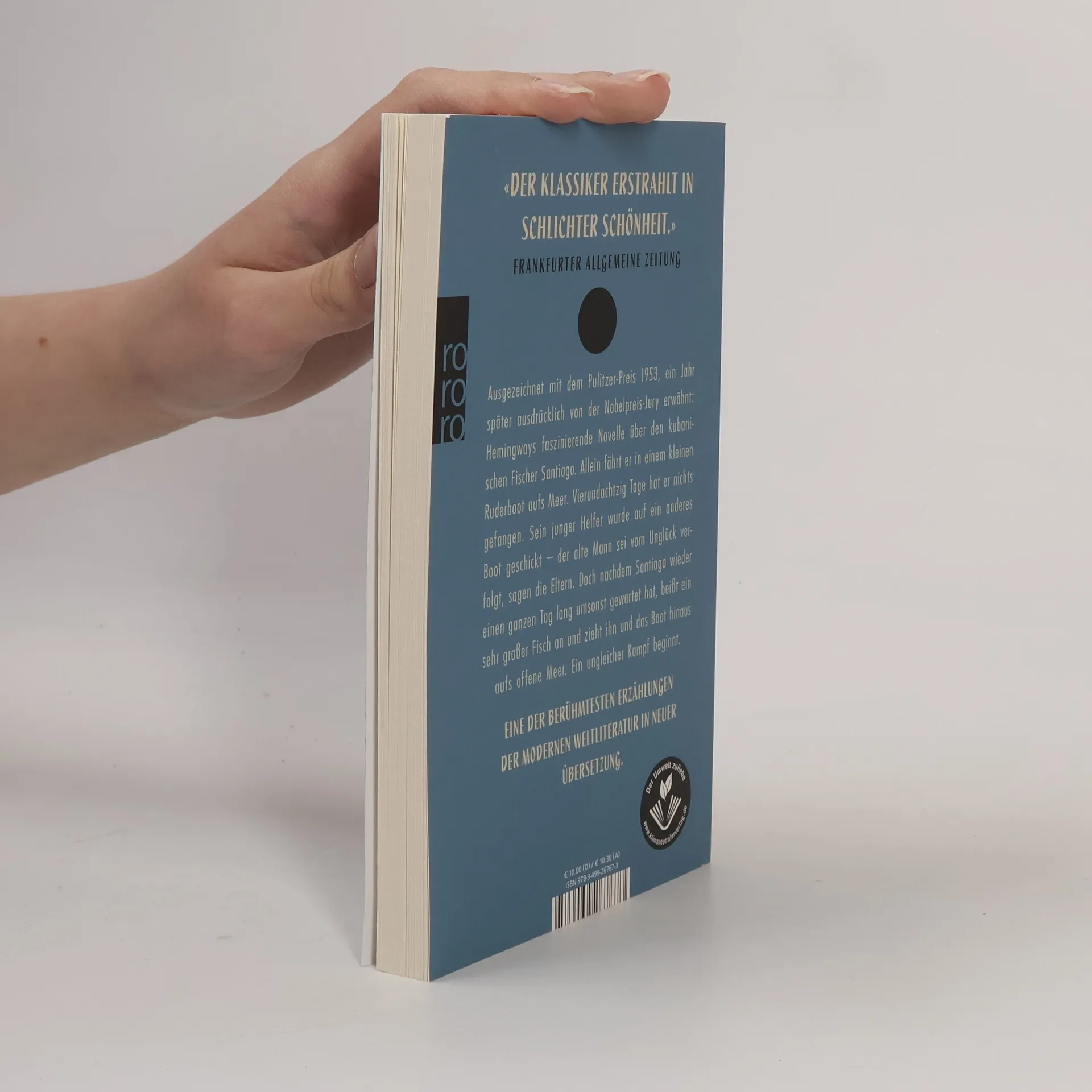 Ausgezeichnet mit dem Pulitzer-Preis 1953, ein Jahr später ausdrücklich von der Nobelpreis-Jury erwähnt: Hemingways faszinierende Novelle über den kubanischen Fischer Santiago. Allein fährt der in einem kleinen Ruderboot aufs Meer. Vierundachtzig Tage hat er nichts gefangen. Sein junger Helfer wurde auf ein anderes Boot geschickt – der alte Mann sei vom Unglück verfolgt, sagen die Eltern. Doch nachdem Santiago wieder einen ganzen Tag lang umsonst gewartet hat, beißt ein sehr großer Fisch an und zieht ihn und das Boot hinaus aufs offene Meer. Ein ungleicher Kampf beginnt. Eine der berühmtesten Erzählungen der modernen Weltliteratur in neuer Übersetzung.