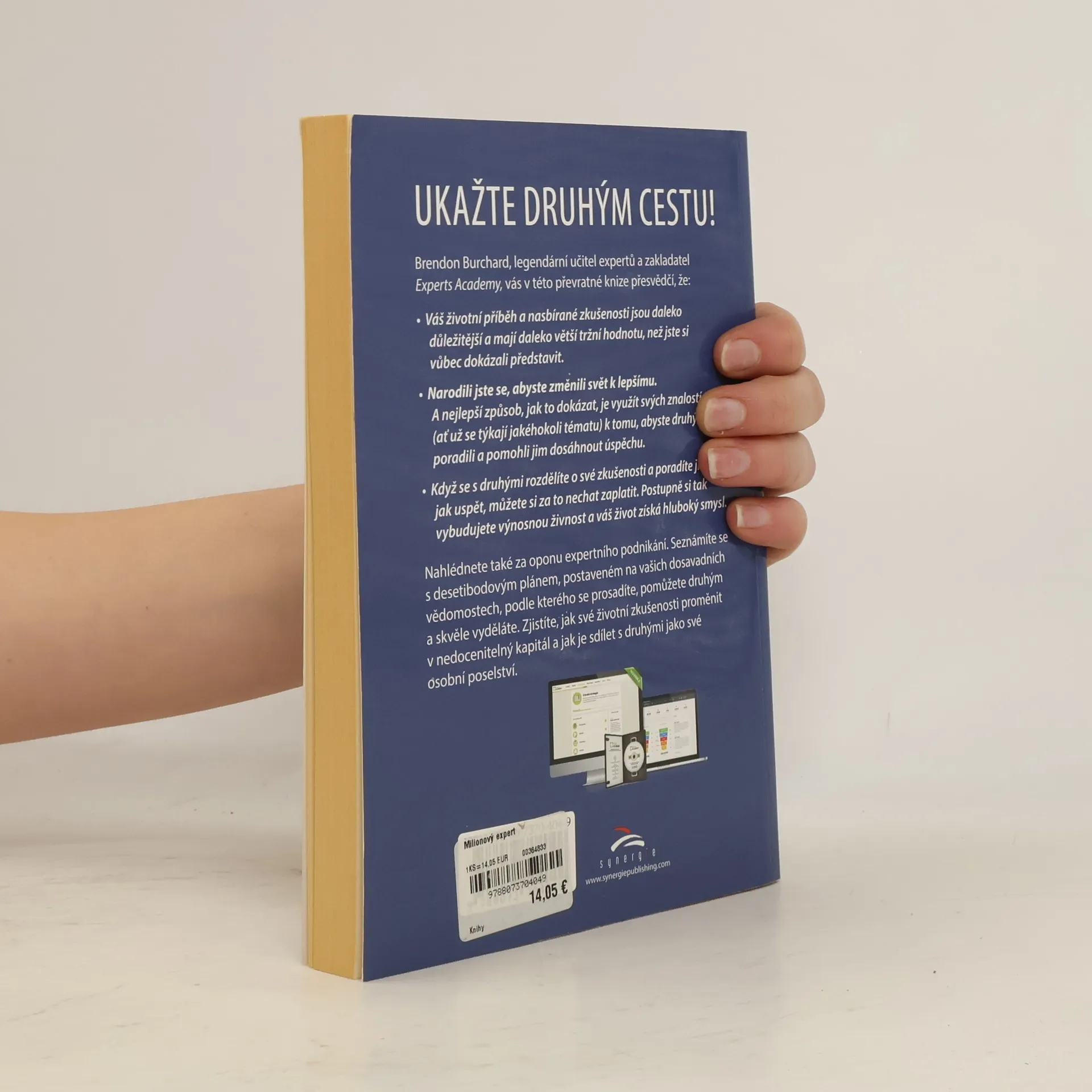 Ukažte druhým cestu! Brendon Burchard, legendární učitel expertů a zakladatel Experts Academy, vás v této převratné knize přesvědčí, že: • Váš životní příběh a nasbírané zkušenosti jsou daleko důležitější a mají daleko větší tržní hodnotu, než jste si vůbec dokázali představit. • Narodili jste se, abyste změnili svět k lepšímu. A nejlepší způsob, jak to dokázat, je využít svých znalostí (ať už se týkají jakéhokoli tématu) k tomu, abyste druhým poradili a pomohli jim dosáhnout úspěchu. • Když se s druhými rozdělíte o své zkušenosti a poradíte jim, jak uspět, můžete si za to nechat zaplatit. Postupně si tak vybudujete výnosnou živnost a váš život získá hluboký smysl. Nahlédnete také za oponu expertního průmyslu. Seznámíte se s desetibodovým plánem, postaveném na vašich dosavadních vědomostech, podle kterého se prosadíte, pomůžete druhým a skvěle vyděláte. Zjistíte, jak své životní zkušenosti proměnit v nedocenitelný kapitál a jak je sdílet s druhými jako své osobní poselství.