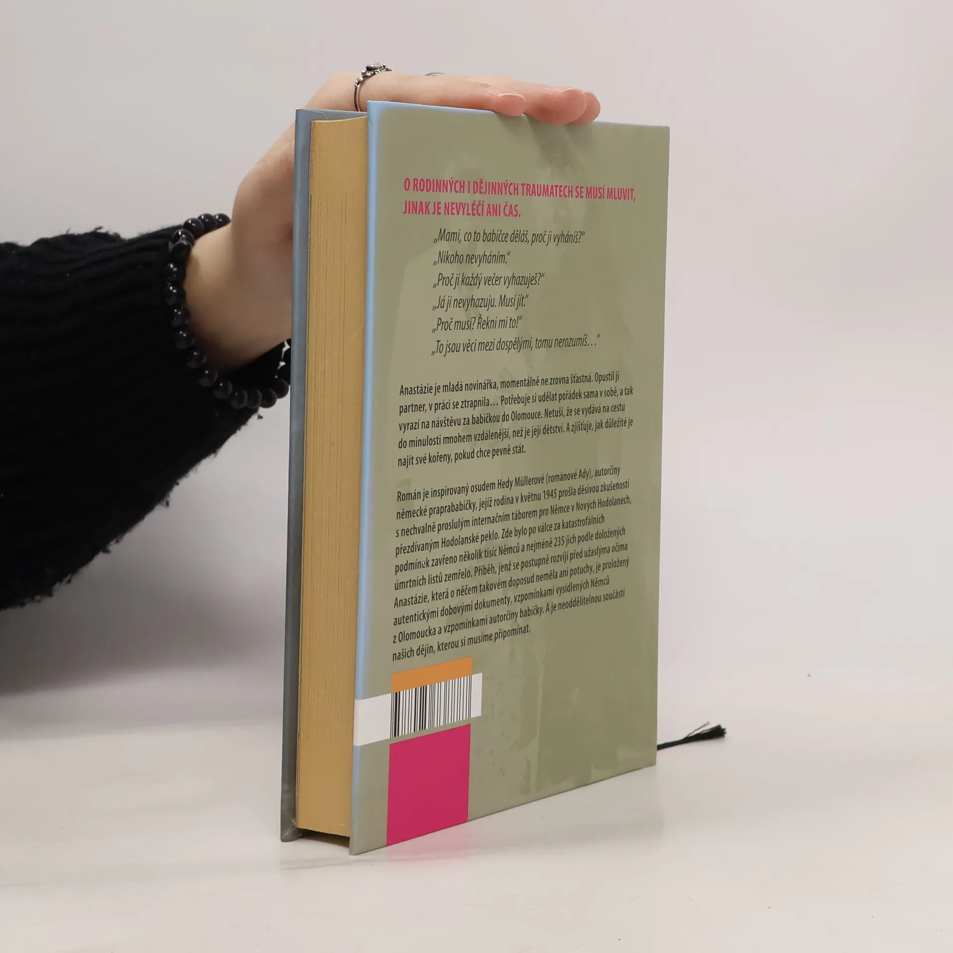 Anastázie je mladá novinářka, momentálně ne zrovna šťastná. Opustil ji partner, v práci se ztrapnila. Potřebuje si udělat pořádek sama v sobě, a tak vyrazí na návštěvu za babičkou do Olomouce. Netuší, že se vydává na cestu do minulosti mnohem vzdálenější, než je její vlastní dětství. A zjišťuje, jak důležité je najít své kořeny, pokud chce pevně stát. Román je inspirovaný osudem Hedy Müllerové, autorčiny německé praprababičky, jejíž rodina v květnu 1945 prošla děsivou zkušeností s nechvalně proslulým internačním táborem pro Němce v Nových Hodolanech, přezdívaným Hodolanské peklo. Zde bylo po válce za katastrofálních podmínek zavřeno několik tisíc Němců a nejméně 235 jich podle doložených úmrtních listů zemřelo. Příběh, jenž se postupně rozvíjí před užaslýma očima Anastázie, která o něčem takovém doposud neměla ani potuchy, je proložený autentickými dobovými dokumenty, vzpomínkami vysídlených Němců z Olomoucka, zážitky lidí internovaných ve sběrných táborech a vzpomínkami autorčiny babičky. A je neoddělitelnou součástí našich dějin, kterou si musíme připomínat.