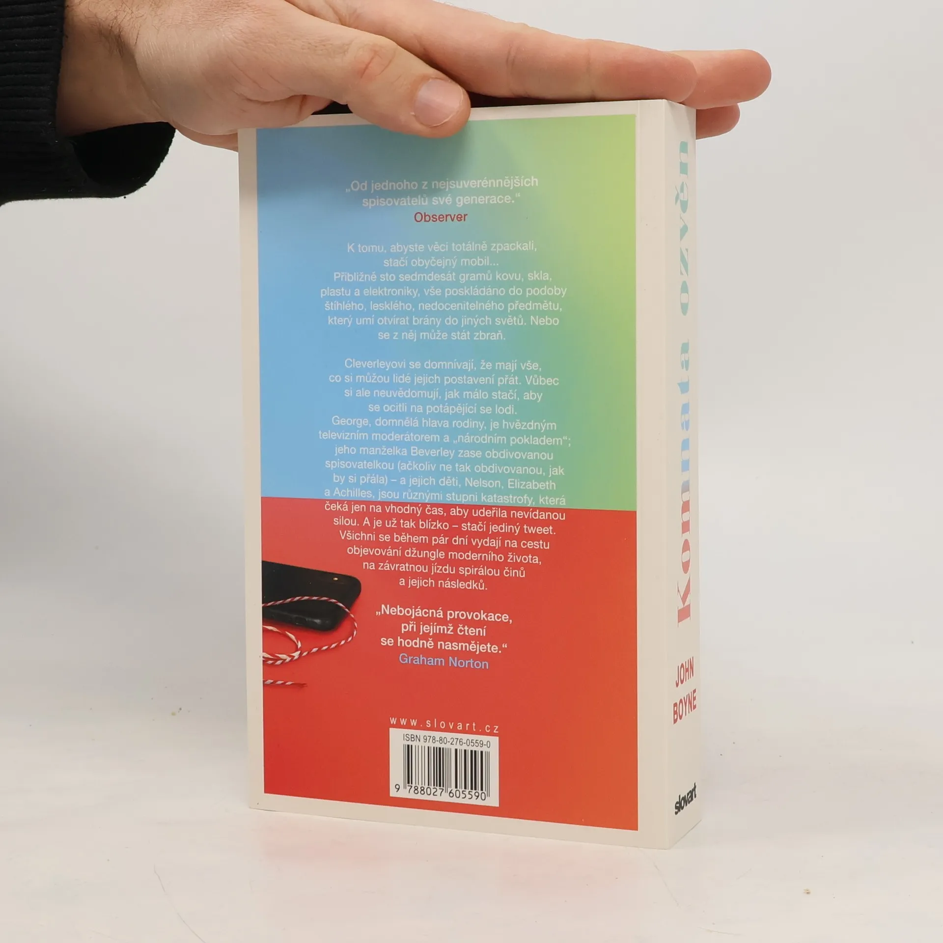 Moderní román irského prozaika předkládá čtenáři zapeklitý příběh plný nečekaných pravd a zrad. Ale i objevování staronových vztahů. To vše ve světle nových technologií, které nám někdy mohou pekelně zkomplikovat život.Román bez servítek a neuvěřitelně zábavným způsobem nastavuje zrcadlo dnešní době, především vlivu médií a sociálních sítí na život společnosti, kde může jediný příspěvek odeslaný z mobilního telefonu na Twitter či Instagram převrátit naruby život jedinci i celé jeho rodině, tak jak se to stalo hrdinům románu, rodině Cleverlyových, žijící v dnešním Londýně. Na jejich příběhu John Boyne ukazuje, jak se tak skvělá věcička jako mobilní telefon, neboli 180 gramů kovu, skla a plastu, může stát v rukou „ignorantů" a „hlupáků" velmi nebezpečnou zbraní. Člověk může být sebelaskavější filantrop, ale stačí pár slov utroušených v dobré víře a míněných jako podpora a svět sociálních sítí si všechno překroutí dle své vůle a učiní z dotyčného monstrum.