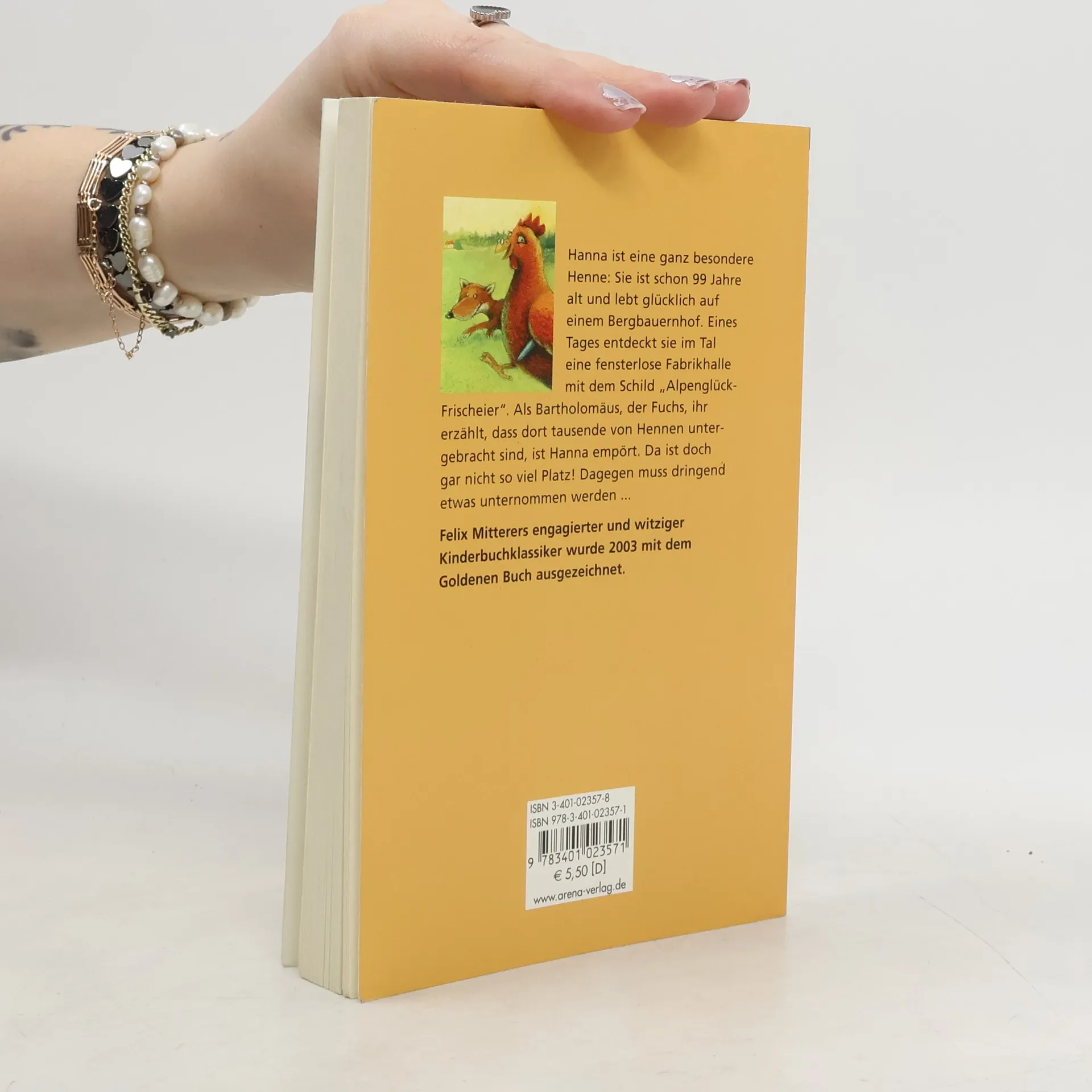 Hanna ist eine ganz besondere Henne: Sie ist schon 99 Jahre alt und lebt glücklich auf einem Bergbauernhof. Eines Tages entdeckt sie im Tal eine fensterlose Fabrikhalle mit dem Schild „Alpenglück-Frischeier“ und Bartholomäus, der Fuchs erzählt ihr, dass dort Tausende von Hennen untergebracht sind. Hanna ist empört, da ist doch gar nicht so viel Platz! Dagegen muss dringend etwas unternommen werden. Felix Mitterers engagierter und witziger Kinderroman wurde 2003 mit dem Goldenen Buch ausgezeichnet.
