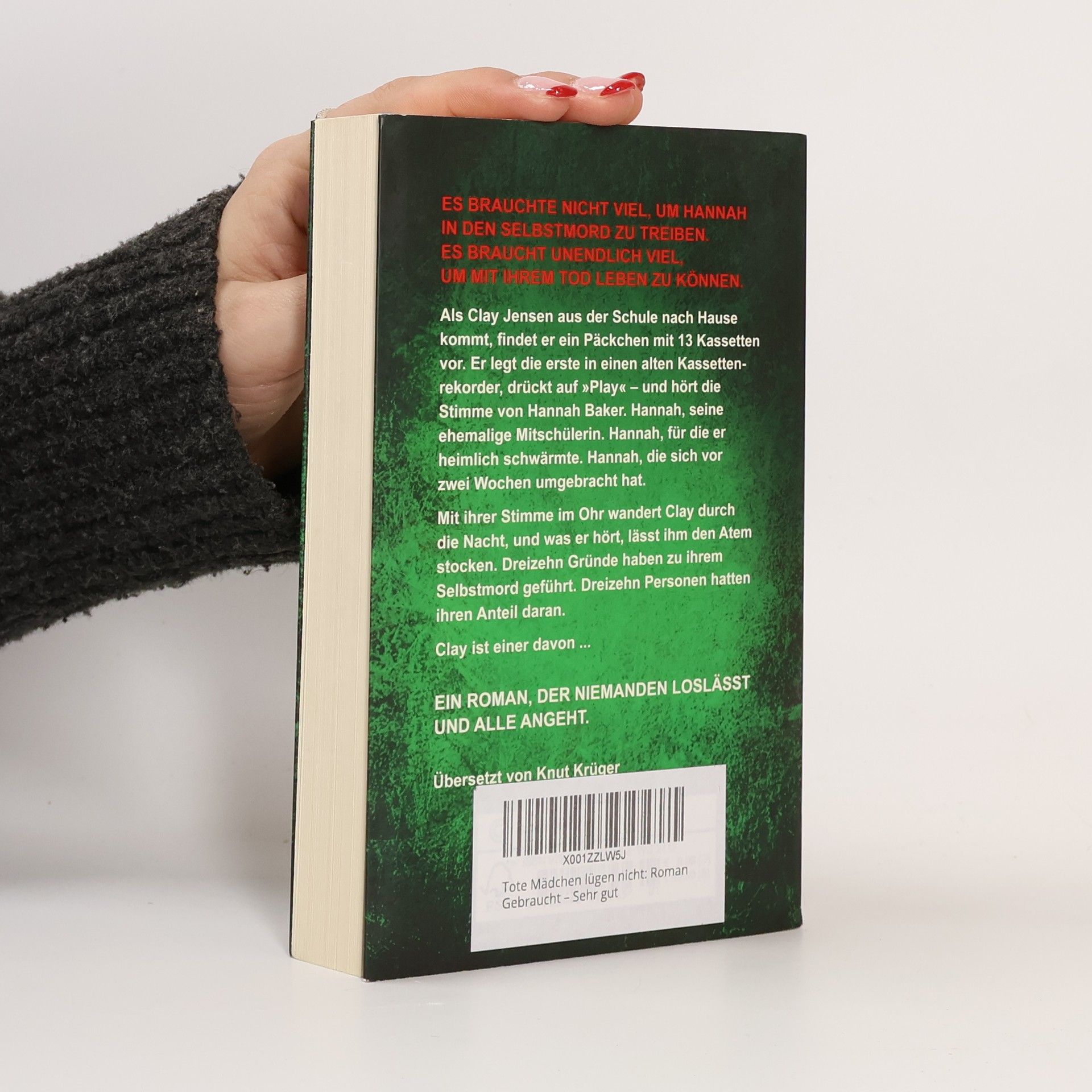 Es brauchte nicht viel, um die Schülerin Hannah in den Selbstmord zu treiben. Es braucht unendlich viel, um mit ihrem Tod leben zu können Als Clay Jensen aus der Schule nach Hause kommt, findet er ein Päckchen mit 13 Kassetten vor. Er legt die erste in einen alten Kassettenrekorder, drückt auf „Play“ – und hört die Stimme von Hannah Baker. Hannah, seine ehemalige Mitschülerin. Hannah, für die er heimlich schwärmte. Hannah, die sich vor zwei Wochen umgebracht hat. Mit ihrer Stimme im Ohr wandert Clay durch die Nacht, und was er hört, lässt ihm den Atem stocken. Dreizehn Gründe sind es, die zu ihrem Selbstmord geführt haben, dreizehn Personen, die daran ihren Anteil haben. Clay ist einer davon ...