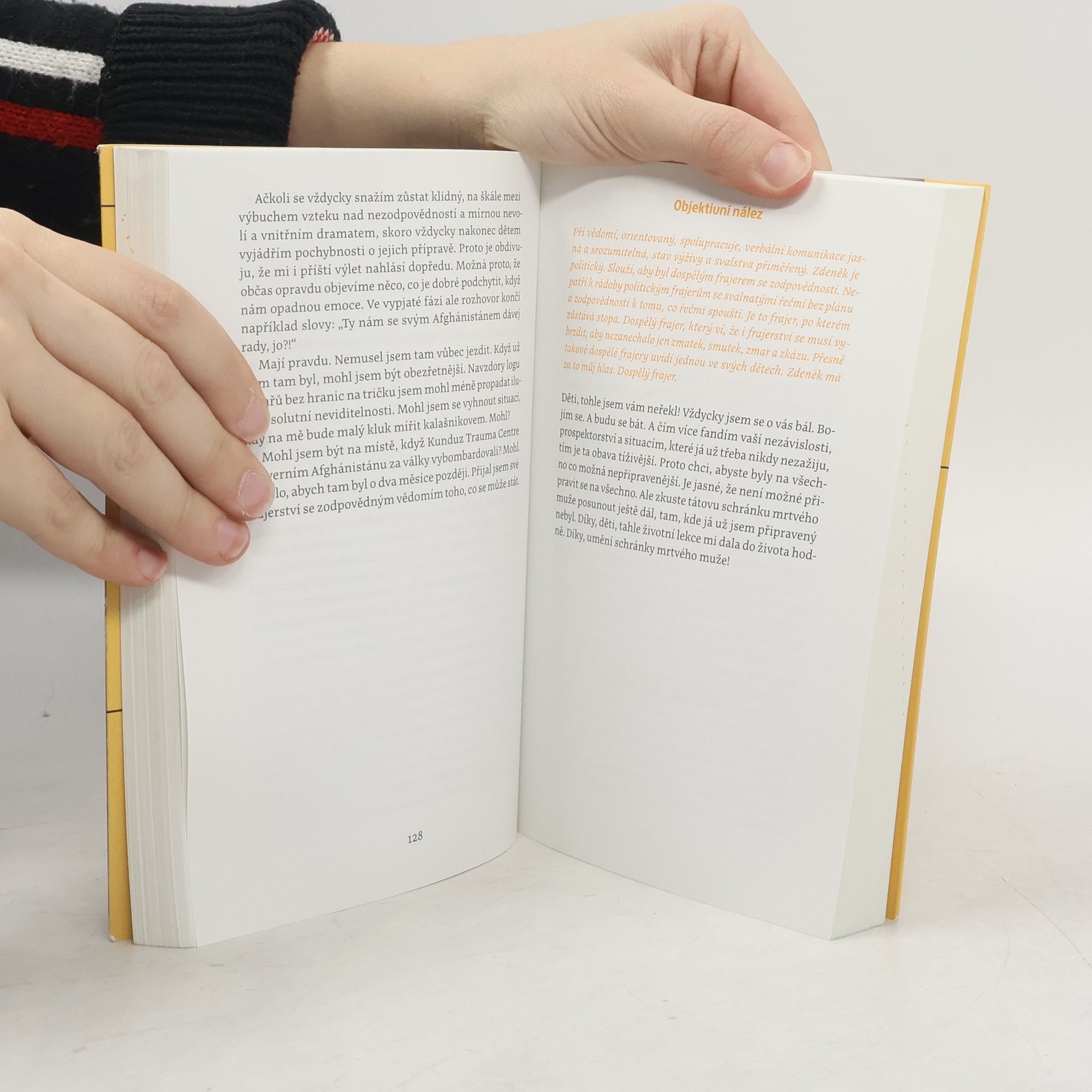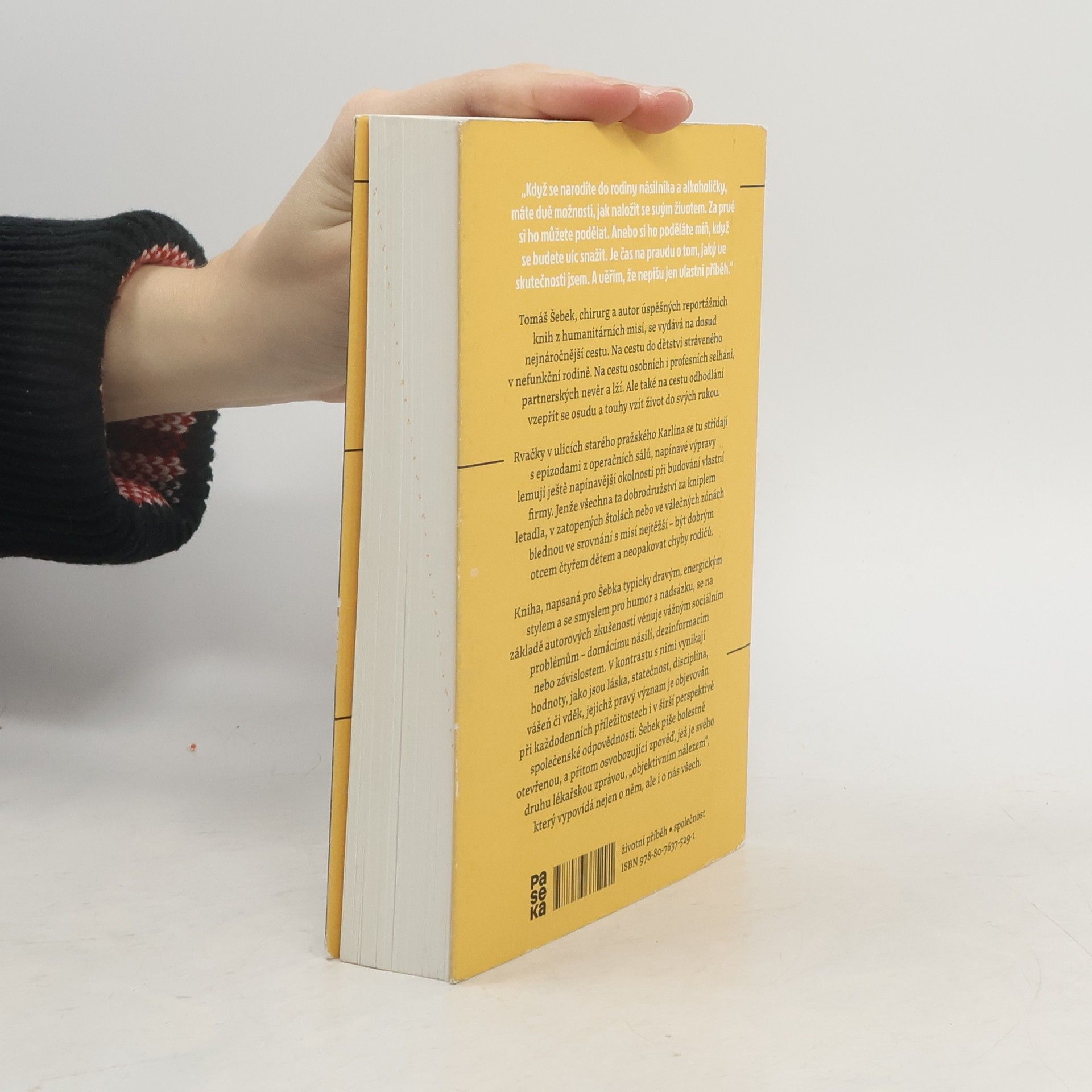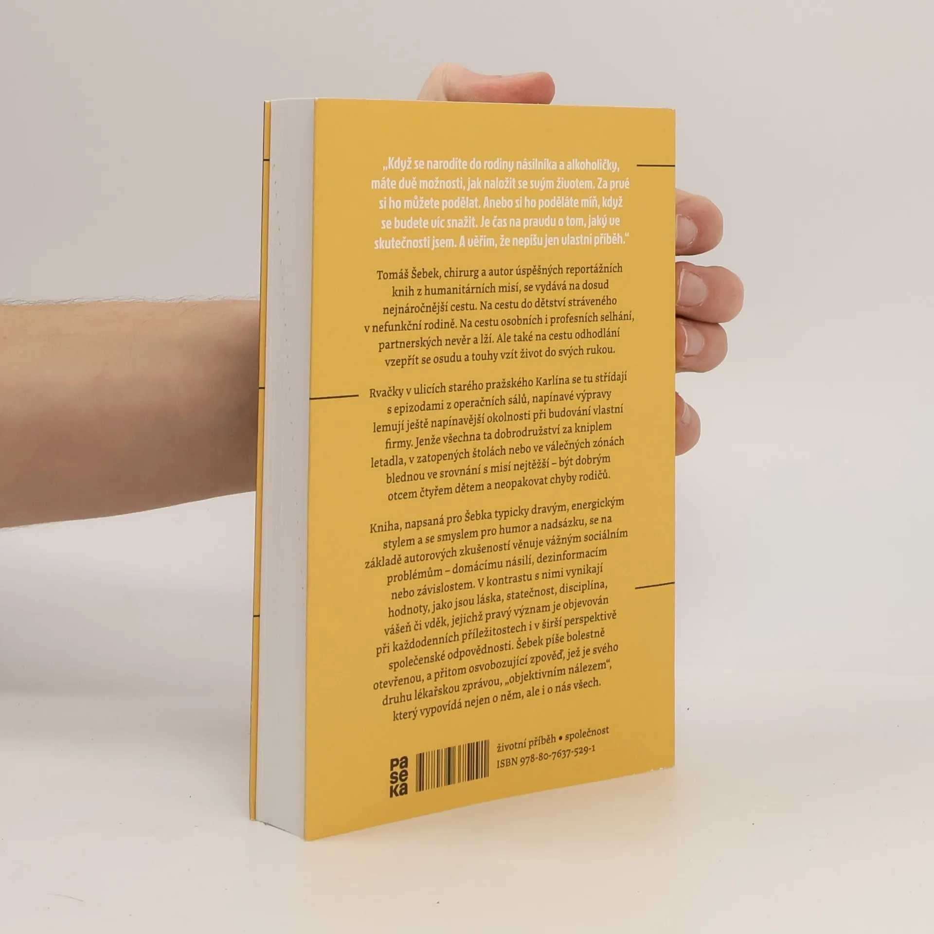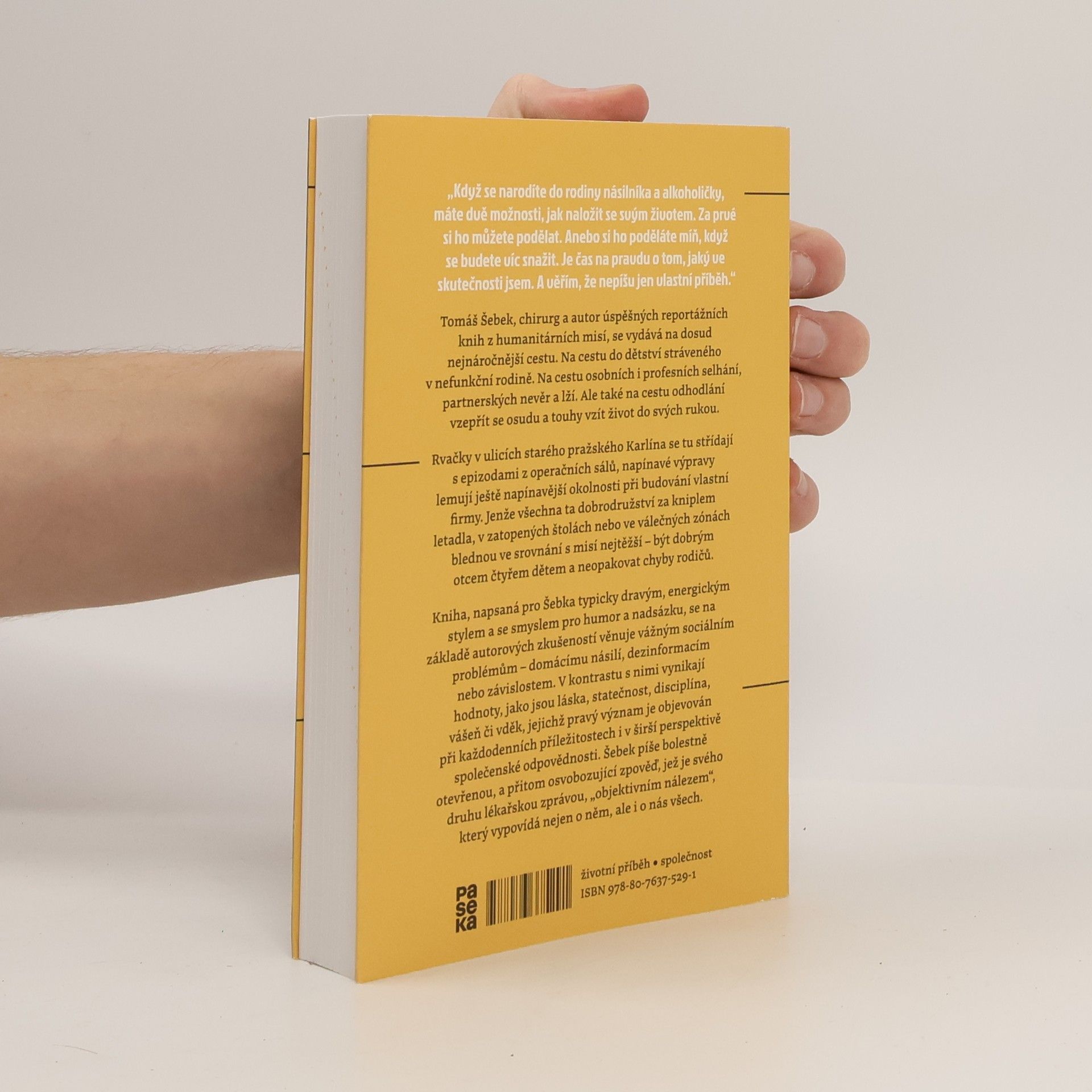 Tomáš Šebek, chirurg a autor úspěšných reportážních knih z humanitárních misí, se vydává na dosud nejnáročnější cestu. Na cestu do dětství stráveného v nefunkční rodině. Na cestu osobních i profesních selhání, partnerských nevěr a lží. Ale také na cestu odhodlání vzepřít se osudu a touhy vzít život do svých rukou. Rvačky v ulicích starého pražského Karlína se tu střídají s epizodami z operačních sálů, napínavé výpravy lemují ještě napínavější okolnosti při budování vlastní firmy. Jenže všechna ta dobrodružství za kniplem letadla, v zatopených štolách nebo ve válečných zónách blednou ve srovnání s misí nejtěžší – být dobrým otcem čtyřem dětem a neopakovat chyby rodičů. Kniha, napsaná pro Šebka typicky dravým, energickým stylem a se smyslem pro humor a nadsázku, se na základě autorových zkušeností věnuje vážným sociálním problémům – domácímu násilí, dezinformacím nebo závislostem. V kontrastu s nimi vynikají hodnoty, jako jsou láska, statečnost, disciplína, vášeň či vděk, jejichž pravý význam je objevován při každodenních příležitostech i v širší perspektivě společenské odpovědnosti. Šebek píše bolestně otevřenou, a přitom osvobozující zpověď, jež je svého druhu lékařskou zprávou, „objektivním nálezem“, který vypovídá nejen o něm, ale i o nás všech.