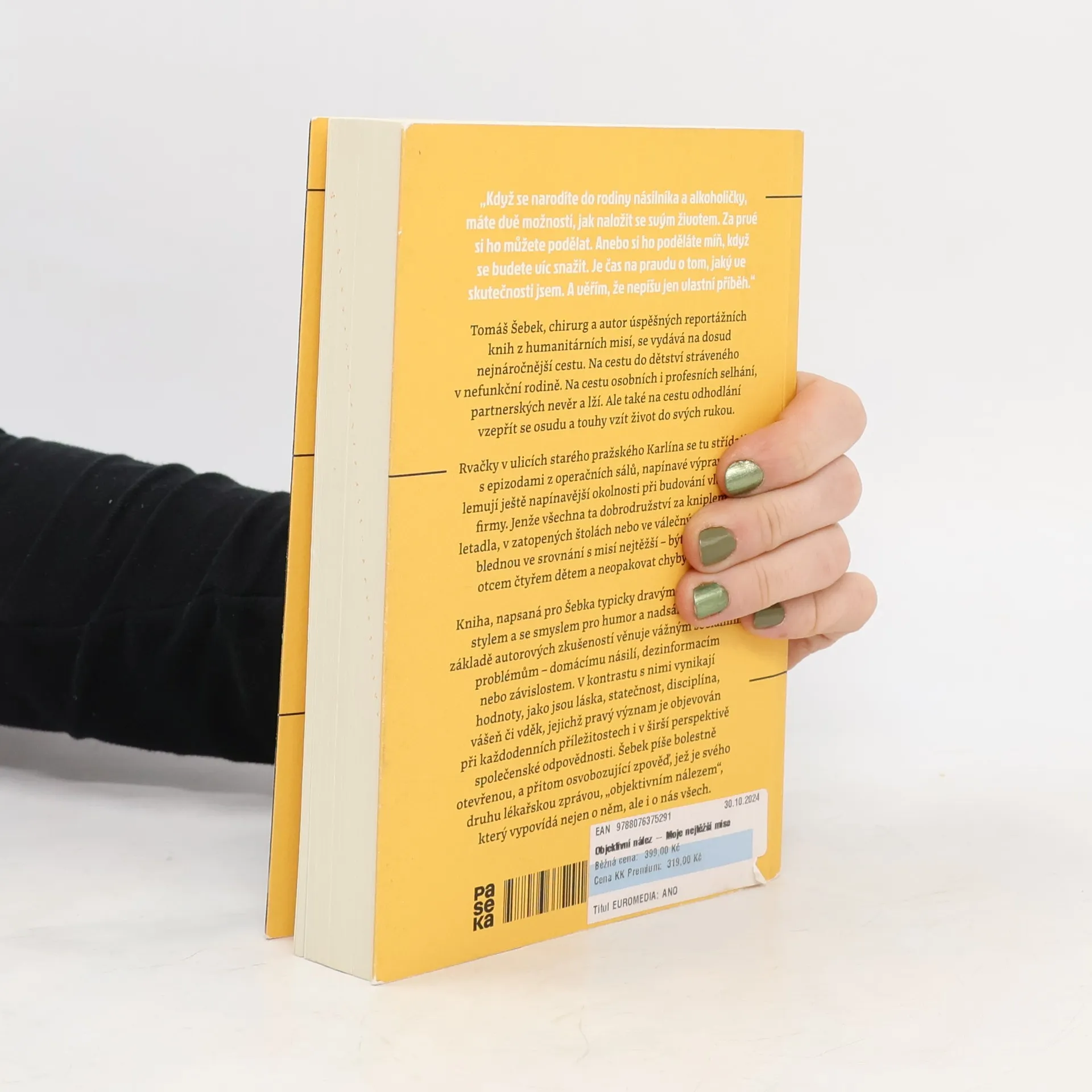 Tomáš Šebek, chirurg a autor úspěšných reportážních knih z humanitárních misí, se vydává na dosud nejnáročnější cestu. Na cestu do dětství stráveného v nefunkční rodině. Na cestu osobních i profesních selhání, partnerských nevěr a lží. Ale také na cestu odhodlání vzepřít se osudu a touhy vzít život do svých rukou. Rvačky v ulicích starého pražského Karlína se tu střídají s epizodami z operačních sálů, napínavé výpravy lemují ještě napínavější okolnosti při budování vlastní firmy. Jenže všechna ta dobrodružství za kniplem letadla, v zatopených štolách nebo ve válečných zónách blednou ve srovnání s misí nejtěžší – být dobrým otcem čtyřem dětem a neopakovat chyby rodičů. Kniha, napsaná pro Šebka typicky dravým, energickým stylem a se smyslem pro humor a nadsázku, se na základě autorových zkušeností věnuje vážným sociálním problémům – domácímu násilí, dezinformacím nebo závislostem. V kontrastu s nimi vynikají hodnoty, jako jsou láska, statečnost, disciplína, vášeň či vděk, jejichž pravý význam je objevován při každodenních příležitostech i v širší perspektivě společenské odpovědnosti. Šebek píše bolestně otevřenou, a přitom osvobozující zpověď, jež je svého druhu lékařskou zprávou, „objektivním nálezem“, který vypovídá nejen o něm, ale i o nás všech.
