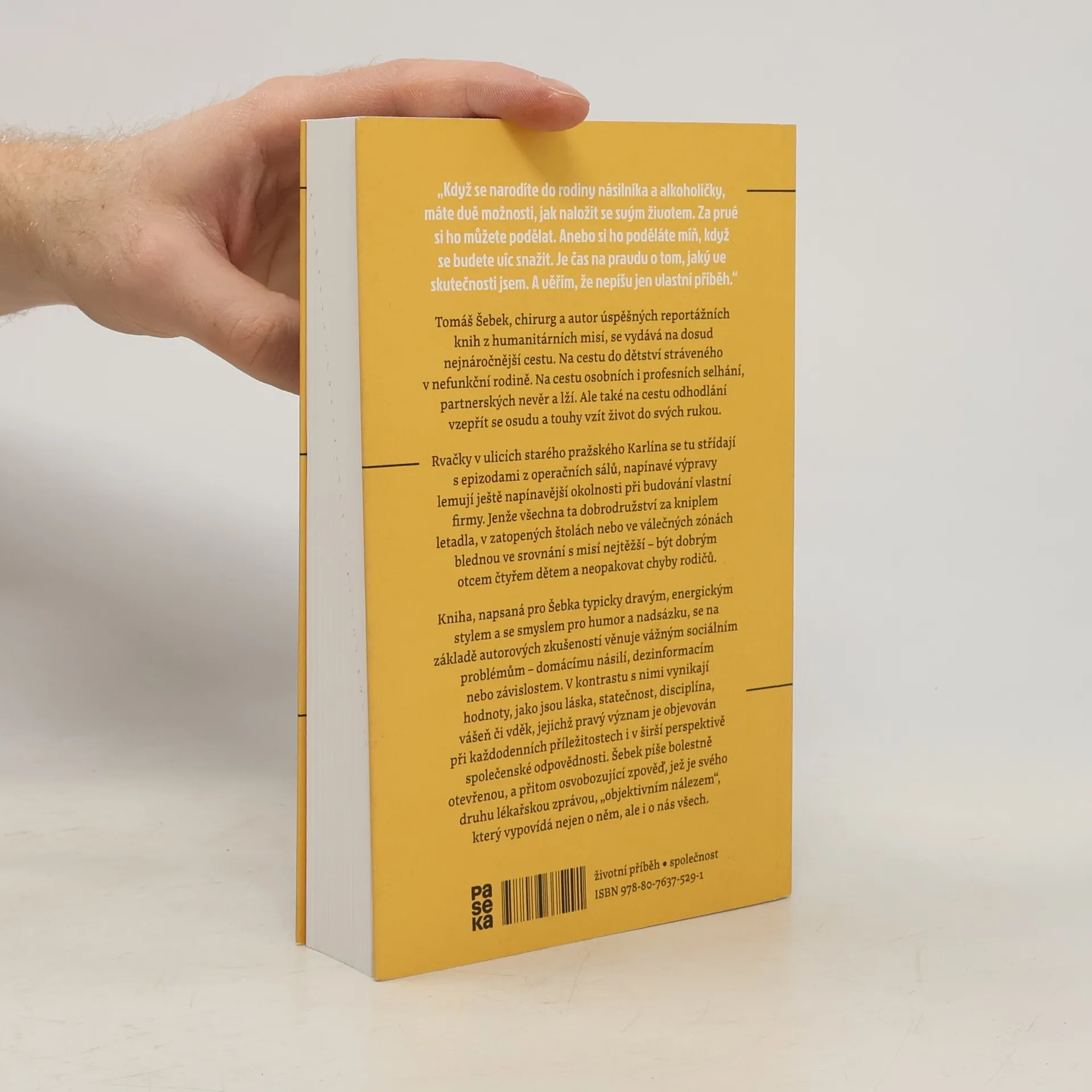 Tomáš Šebek, chirurg a autor úspěšných reportážních knih z humanitárních misí, se vydává na dosud nejnáročnější cestu. Na cestu do dětství stráveného v nefunkční rodině. Na cestu osobních i profesních selhání, partnerských nevěr a lží. Ale také na cestu odhodlání vzepřít se osudu a touhy vzít život do svých rukou. Rvačky v ulicích starého pražského Karlína se tu střídají s epizodami z operačních sálů, napínavé výpravy lemují ještě napínavější okolnosti při budování vlastní firmy. Jenže všechna ta dobrodružství za kniplem letadla, v zatopených štolách nebo ve válečných zónách blednou ve srovnání s misí nejtěžší – být dobrým otcem čtyřem dětem a neopakovat chyby rodičů. Kniha, napsaná pro Šebka typicky dravým, energickým stylem a se smyslem pro humor a nadsázku, se na základě autorových zkušeností věnuje vážným sociálním problémům – domácímu násilí, dezinformacím nebo závislostem. V kontrastu s nimi vynikají hodnoty, jako jsou láska, statečnost, disciplína, vášeň či vděk, jejichž pravý význam je objevován při každodenních příležitostech i v širší perspektivě společenské odpovědnosti. Šebek píše bolestně otevřenou, a přitom osvobozující zpověď, jež je svého druhu lékařskou zprávou, „objektivním nálezem“, který vypovídá nejen o něm, ale i o nás všech.