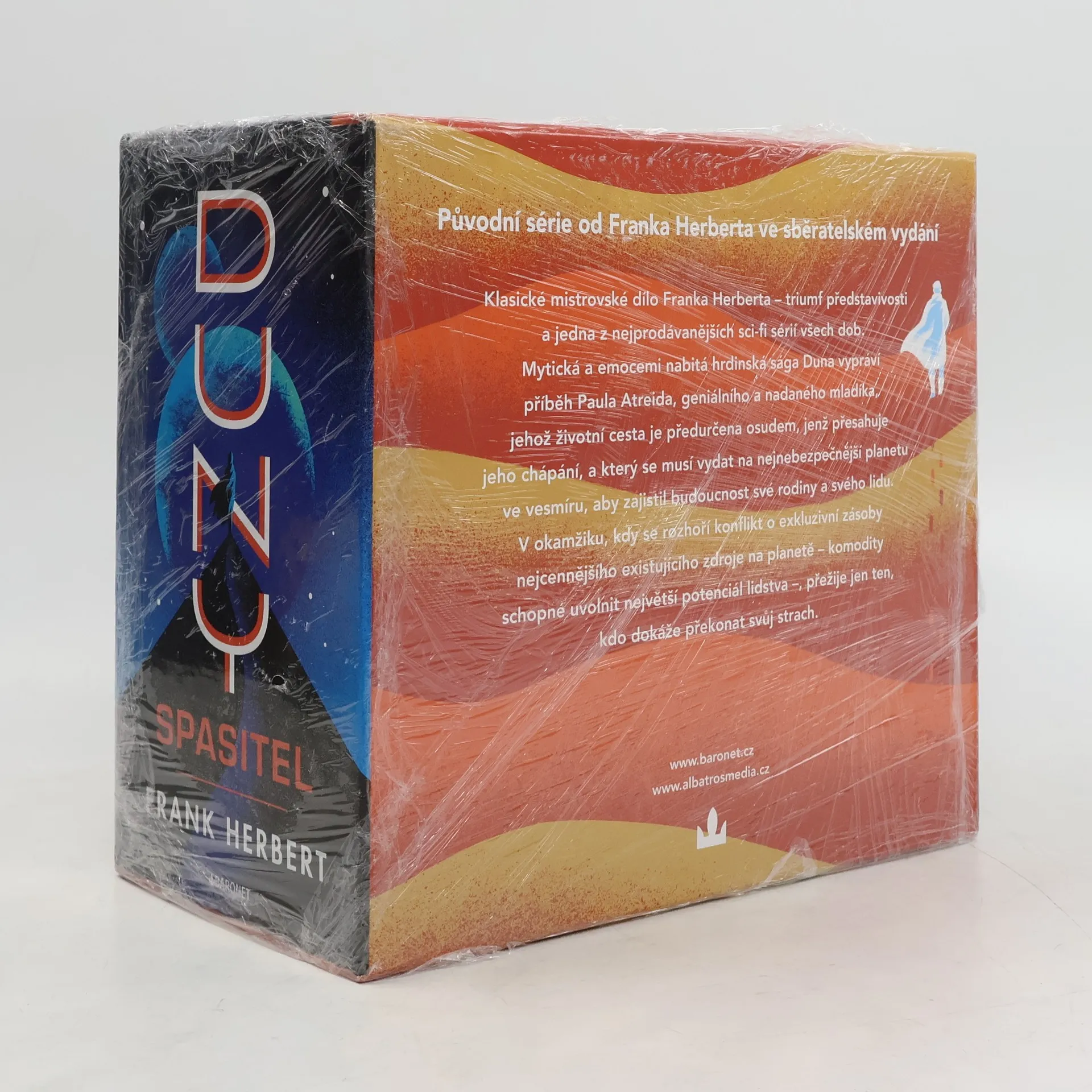 Původní série Duna v jednom boxu! Kdo ovládá Arrakis, ovládá vše! Příběh Duny se odehrává v daleké budoucnosti v mezihvězdném impériu, kterému vládne padišáh imperátor Shaddam IV. z rodu Corrino, jemuž jsou podřízené všechny velkorody. Mladý Paul Atreides – dědic a následovník rodu Atreidů – odlétá se svým otcem vévodou Letem a matkou Jessikou na Arrakis, pouštní planetu, jež je jediným zdrojem výjimečného koření, nejdůležitější a nejcennější látky ve vesmíru s podivuhodnými vlastnostmi. Rod Atreidů má planetu spravovat poté, co ji opustili jejich odvěcí nepřátelé, Harkonnenové. A v tu chvíli se rozbíhá mnohovrstvá interakce složitého světa politiky, náboženství, ekologie, technologie a lidských emocí, to vše ve snaze ovládnout Arrakis, protože ten, kdo ovládá Arrakis, ovládá i koření...