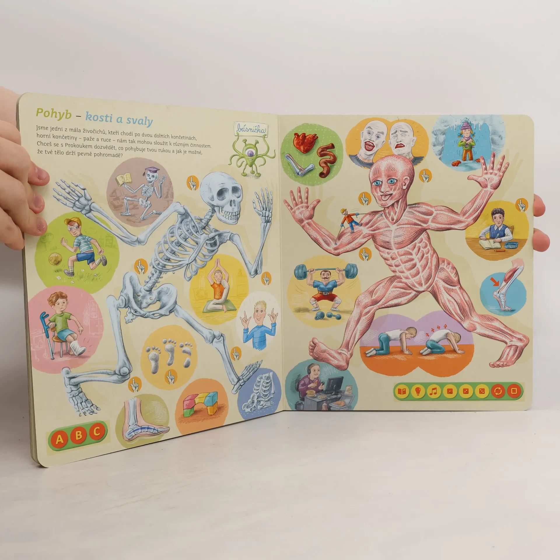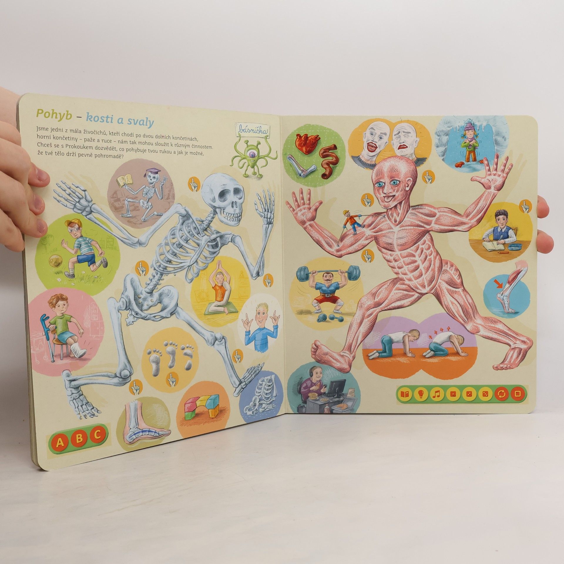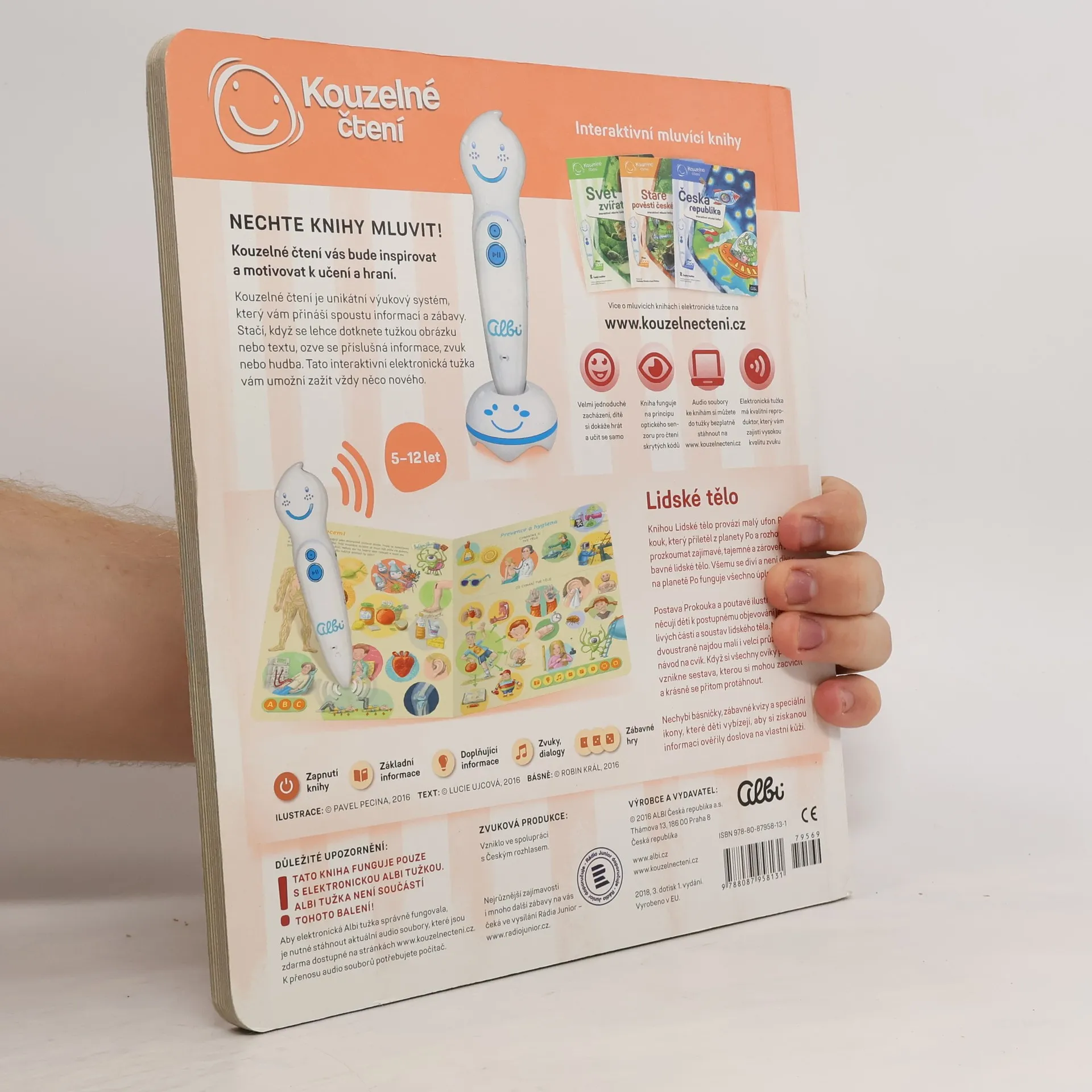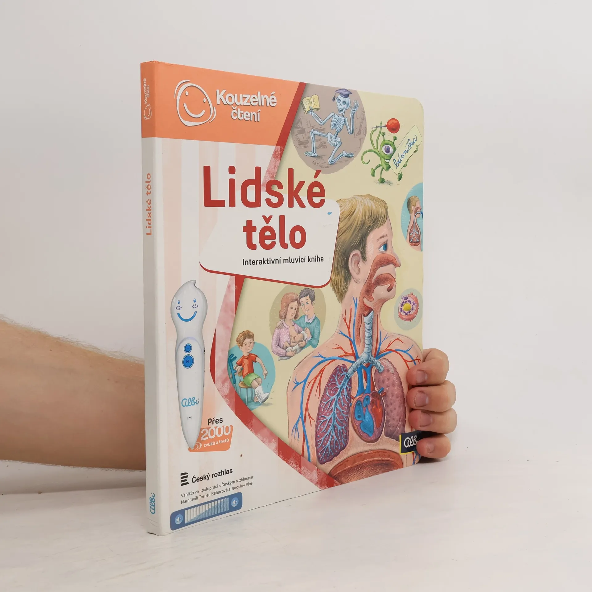 Interaktivní mluvící kniha z edice Kouzelné čtení, se kterou se děti již od 3 let dozvědí spoustu zajímavých a užitečných informací o našem těle. Knihou Lidské tělo provází malý ufon Prokouk, který přiletěl z planety Po, aby prozkoumal taje lidského těla. Všemu se diví a není divu: na planetě Po funguje všechno úplně jinak! Postava Prokouka a poutavé ilustrace podněcují děti k postupnému objevování jednotlivých částí a soustav lidského těla. Kniha je členěna do 8 kapitol a témata jsou např. Kosti a svaly, Mozek a nervy, Rozmnožování, Trávicí soustava, Srdce a plíce atd. Na každé dvoustraně najdou malí i velcí průzkumníci návod na cvik. Když si všechny cviky propojí, vznikne sestava, kterou si mohou zacvičit a krásně se přitom protáhnout. V knize Lidské tělo najdete také básničky, zábavné kvízy a speciální ikony, které děti vybízí, aby si získanou informaci zkusili doslava na vlastní kůži. Kniha obsahuje téměř 2000 zvuků a textů. Knihu ilustroval Pavel Pecina, básničky napsal Robin Král, texty Lucie Ujcová. Vzniklo ve spolupráci s Českým rozhlasem, knihu namluvili Tereza Bebarová a Jaroslav Plesl.