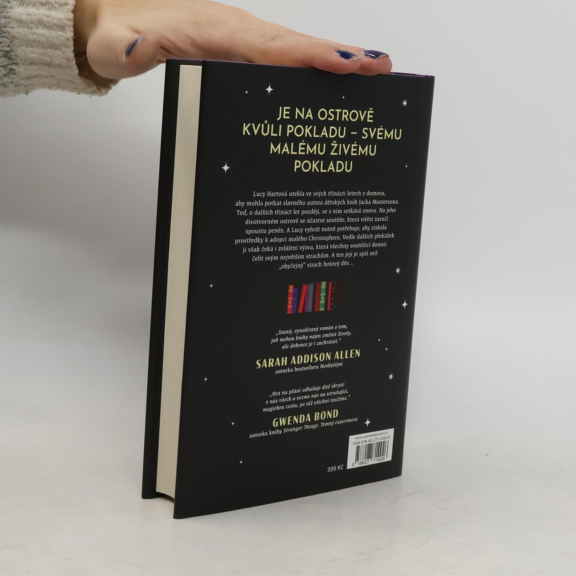 Hřejivý příběh plný narážek na knihy. Populární autor ukrytý na ostrově vyhlásí hru pro své nejvěrnější fanoušky. Dávejte si pozor na to, co si přejete. Lucy Hartová ví lépe než kdokoli jiný, jaké je vyrůstat bez milujících rodičů. V dětství byla osamělá a zanedbávaná a útěchu nacházela v knihách, především v sérii knížek z Hodinového ostrova od Jacka Mastersona. Teď je jí šestadvacet, pracuje jako asistentka učitele a svou lásku ke knihám předává svým žákům, mezi nimiž je i sedmiletý osiřelý Christopher, který žije u pěstounů. Lucy by udělala cokoliv pro to, aby ho mohla adoptovat, ale zdá se, že pokud nebude mít dost peněz, chlapce jí nikdo nesvěří. Lucy už se málem vzdává, když Jack Masterson nečekaně oznámí, že po letech napsal další knihu, a navíc vyhlásí soutěž, která se má konat v jeho domě na Hodinovém ostrově. Nakladatelská anotace. Kráceno.