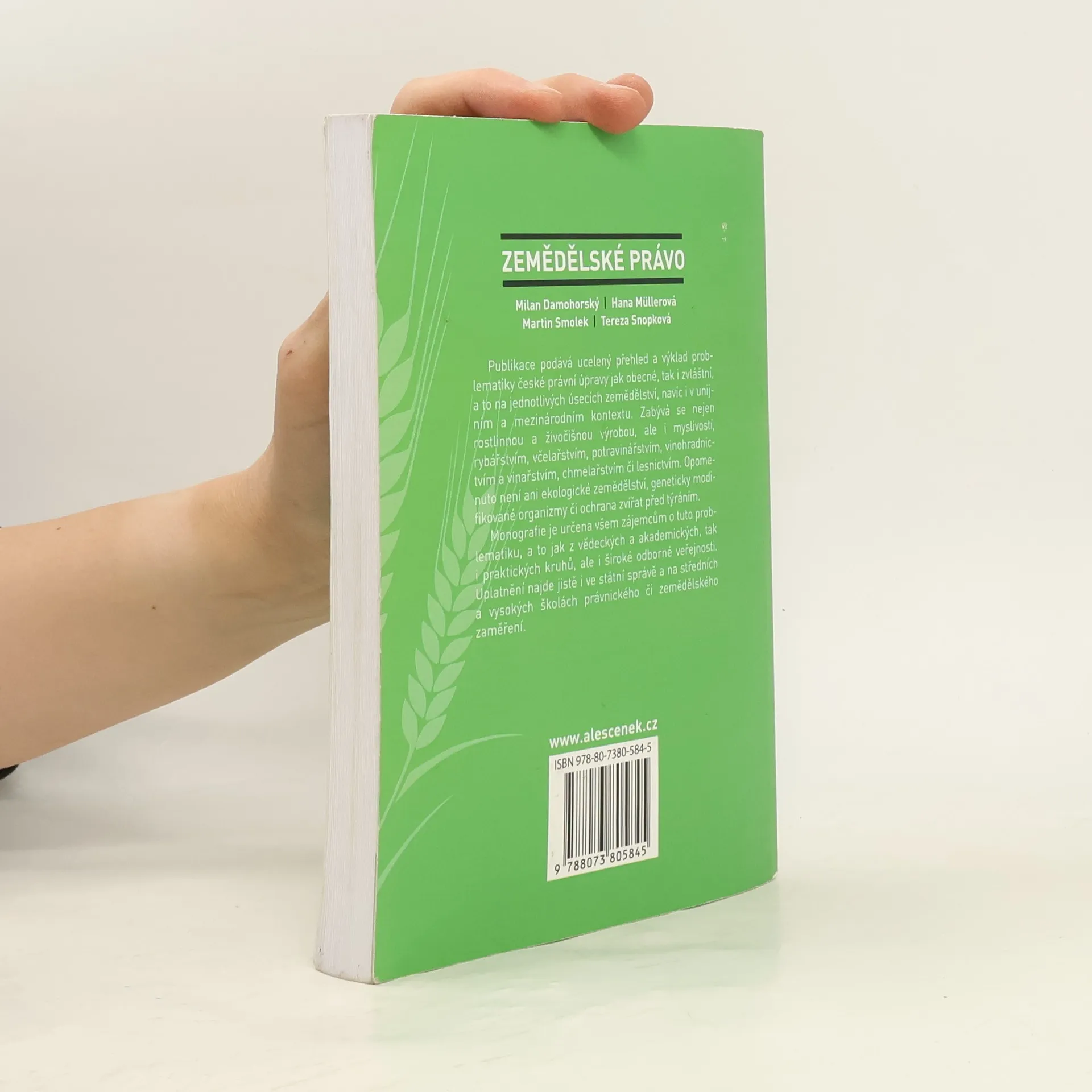 Publikace podává ucelený přehled a výklad problematiky české právní úpravy jako obecné, tak i zvláštní, a to na jednotlivých úsecích zemědělství, navíc i v unijním a mezinárodním kontextu. Zabývá se nejen rostlinnou a živočišnou výrobou, ale i mysli-vostí, rybářstvím, včelařstvím, potravinářstvím, vinohradnictvím a vinařstvím, chmelařstvím či lesnictvím. Opominuto není ani ekologické zemědělství, geneticky modifikované organismy či ochrana zvířat před týráním. Monografie je určena všem zájemců o tuto problematiku, a to jak z vědeckých a akademických, tak i praktických kruhů, ale i široké odborné veřejnosti. Uplatnění najde jistě i ve státní správě a na středních a vysokých školách právnického či zemědělského zaměření.