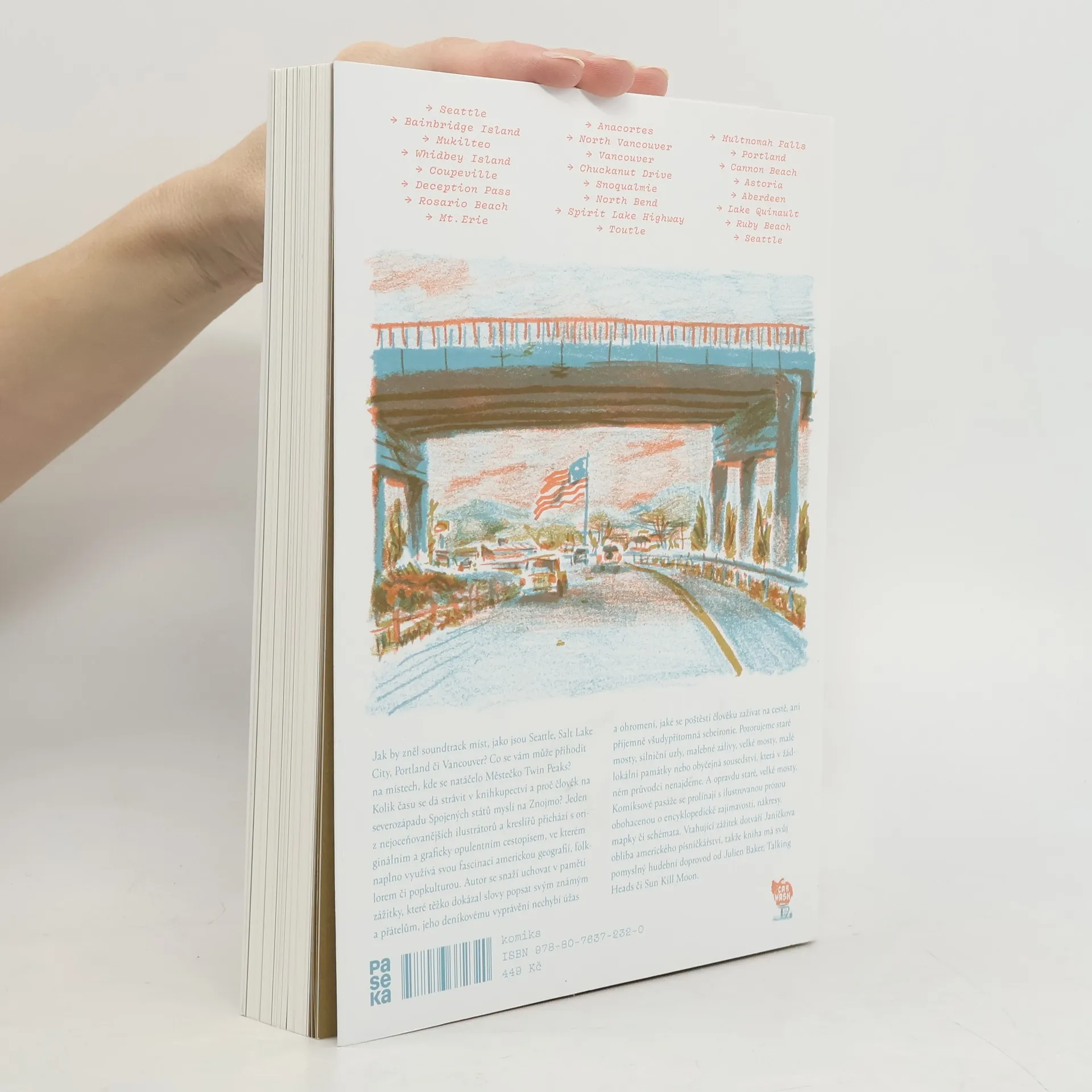 Jak by zněl soundtrack míst, jako jsou Seattle, Salt Lake City, Portland či Vancouver? Co se vám může přihodit na místech, kde se natáčelo Městečko Twin Peaks? Kolik času se dá strávit v knihkupectví a proč člověk na severozápadu Spojených států myslí na Znojmo? Jindřich Janíček přichází s originálním a graficky opulentním cestopisem, ve kterém naplno využívá svou fascinaci americkou geografií, folklorem či popkulturou. Autor se snaží uchovat v paměti zážitky, které těžko dokázal slovy popsat svým známým a přátelům, jeho deníkovému vyprávění nechybí úžas a ohromení, jaké se poštěstí člověku zažívat na cestě, ani příjemně všudypřítomná sebeironie. Vtahující zážitek dotváří Janíčkova obliba amerického písničkářství, takže kniha má svůj pomyslný hudební doprovod od Julien Baker, Talking Heads či Sun Kill Moon.
