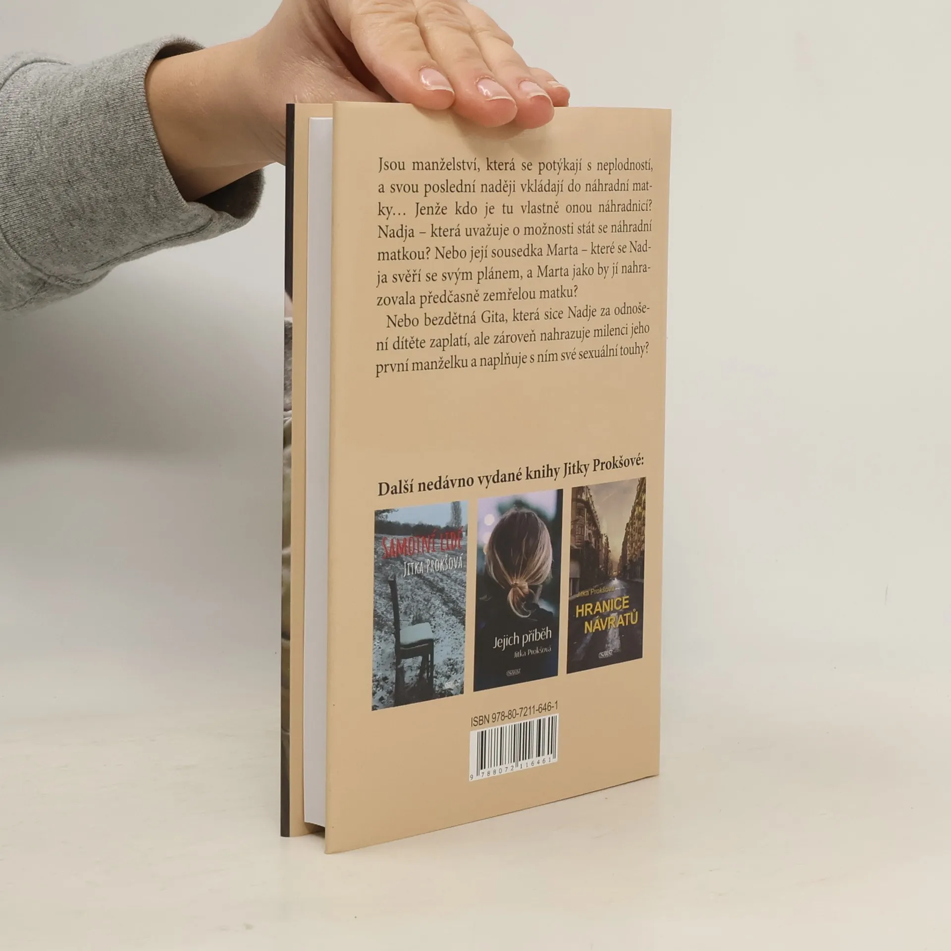 Emocemi nabitý, netypický příběh náhradního mateřství, vyprávěný z pohledu několika aktérů, prováže jejich životy křivdou, která se nemusela stát. Píše se rok 2015 – osamělá Nadja chce pomoct sobě a svému malému synovi z finančních problémů a zároveň bezdětnému páru, Petrovi a Gitě, splnit sen o vlastním dítěti. Něco se ale zvrtne a porod neproběhne podle předchozí domluvy… To je důvod, proč v Nadje později stále hlodá touha dozvědět se pravdu. Po osmi letech, kdy vzpomínka na porod už skoro vybledla, se jí v poště objeví e-mail od Petra. Co všechno dokáže změnit? Román Náhradnice se zabývá nejen úskalím náhradního mateřství, ale i křehkými partnerskými a rodinnými vztahy.