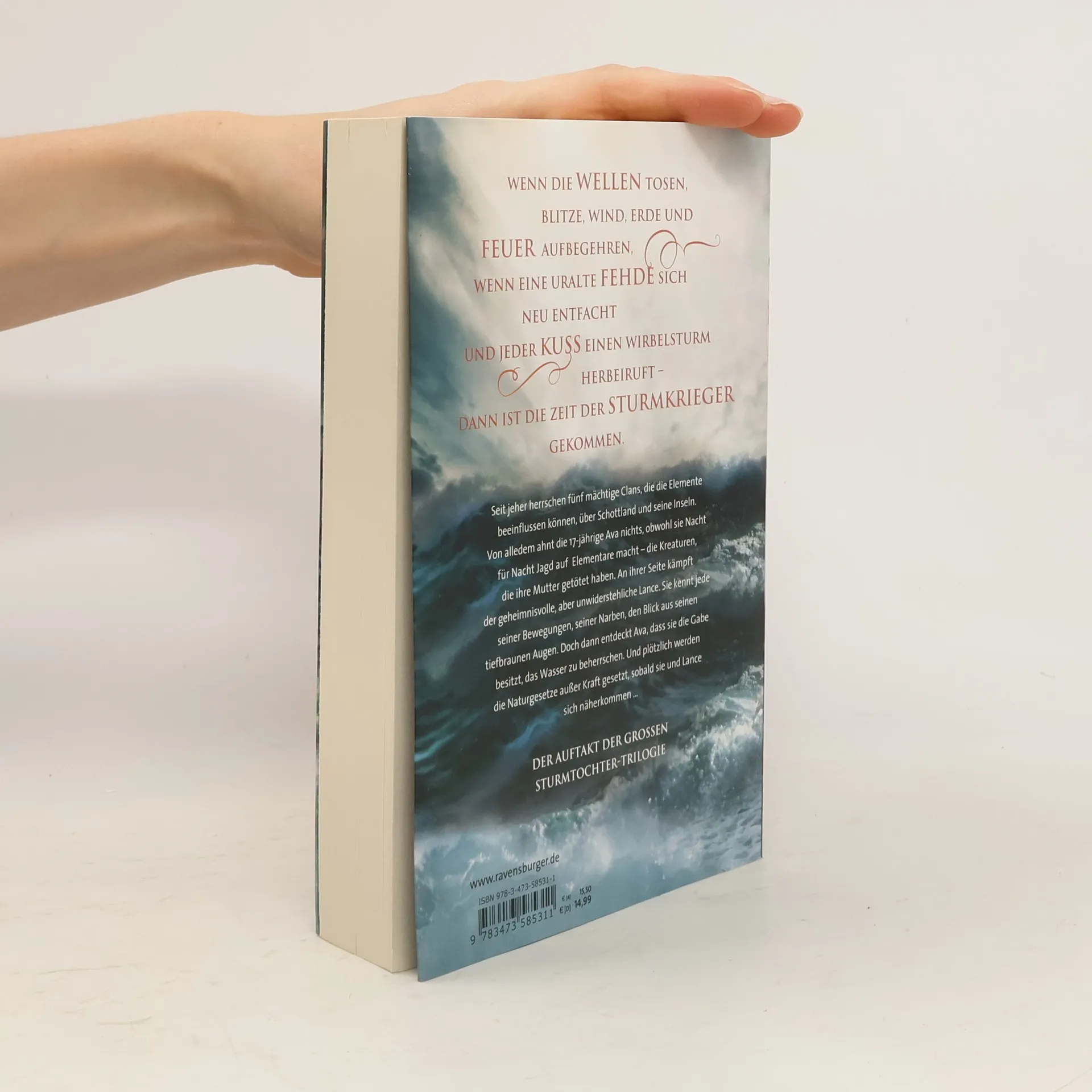 Wenn die Wellen tosen, Blitze, Wind, Erde und Feuer aufbegehren, wenn eine uralte Fehde sich neu entfacht und jeder Kuss einen Wirbelsturm herbeiruft – dann ist die Zeit der Sturmkrieger gekommen. Seit jeher herrschen fünf mächtige Clans, die die Elemente beeinflussen können, über Schottland und seine Inseln. Von alledem ahnt die 17-jährige Ava nichts, obwohl sie Nacht für Nacht Jagd auf Elementare macht – die Kreaturen, die ihre Mutter getötet haben. An ihrer Seite kämpft der geheimnisvolle, aber unwiderstehliche Lance. Sie kennt jede seiner Bewegungen, seiner Narben, den Blick aus seinen tiefbraunen Augen. Doch dann entdeckt Ava, dass sie die Gabe besitzt, das Wasser zu beherrschen. Und plötzlich werden die Naturgesetze außer Kraft gesetzt, sobald sie und Lance sich näherkommen …