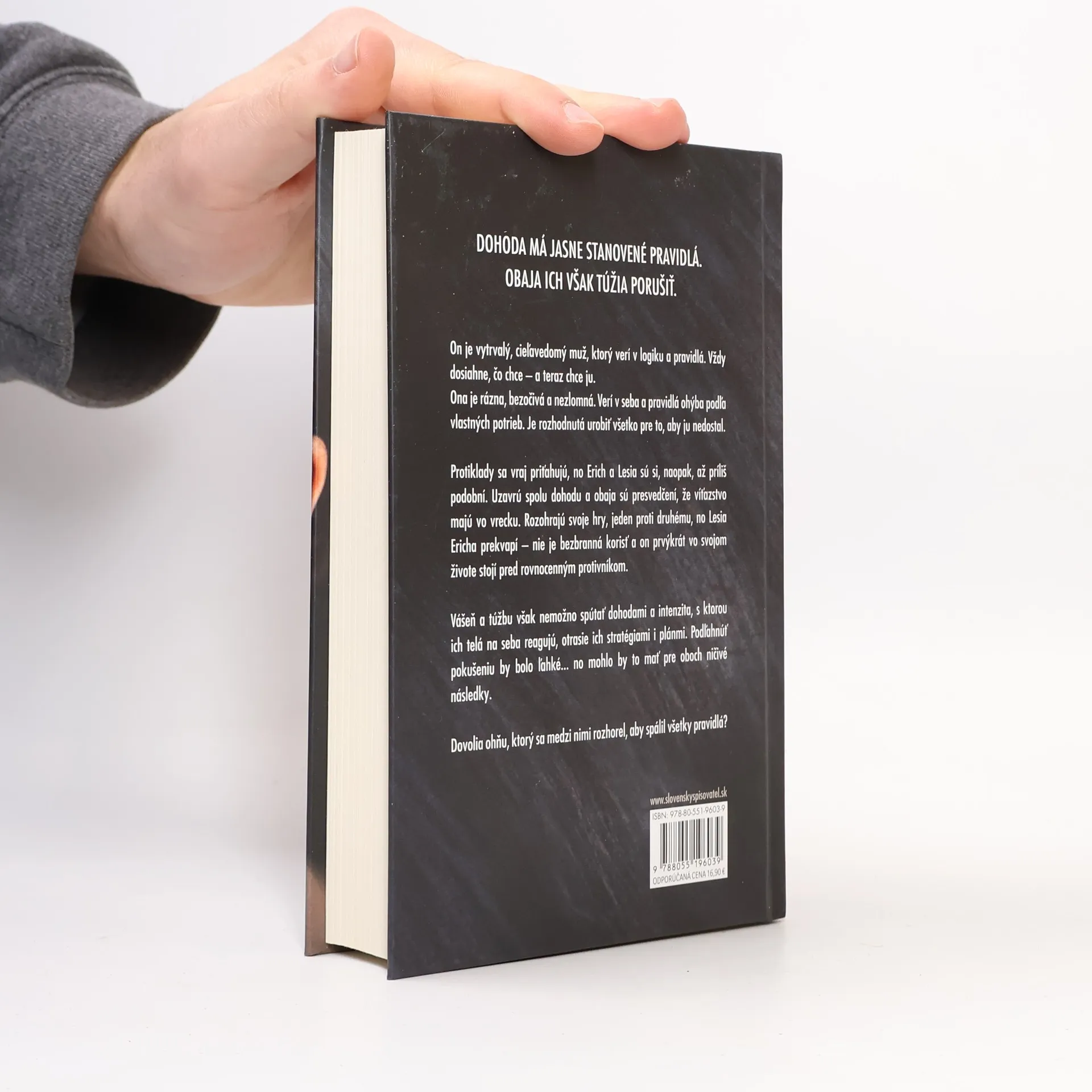 Dohoda má jasne stanovené pravidlá. Obaja ich však túžia porušiť. On je vytrvalý, cieľavedomý muž, ktorý verí v logiku a pravidlá. Vždy dosiahne, čo chce – a teraz chce ju. Ona je rázna, bezočivá a nezlomná. Verí v seba a pravidlá ohýba podľa vlastných potrieb. Je rozhodnutá urobiť všetko pre to, aby ju nedostal. Protiklady sa vraj priťahujú, no Erich a Lesia sú si, naopak, až príliš podobní. Uzavrú spolu dohodu a obaja sú presvedčení, že víťazstvo majú vo vrecku. Rozohrajú svoje hry, jeden proti druhému, no Lesia Ericha prekvapí – nie je bezbranná korisť a on prvýkrát vo svojom živote stojí pred rovnocenným protivníkom. Vášeň a túžbu však nemožno spútať dohodami a intenzita, s ktorou ich telá na seba reagujú, otrasie ich stratégiami i plánmi. Podľahnúť pokušeniu by bolo ľahké… no mohlo by to mať pre oboch ničivé následky. Dovolia ohňu, ktorý sa medzi nimi rozhorel, aby spálil všetky pravidlá?