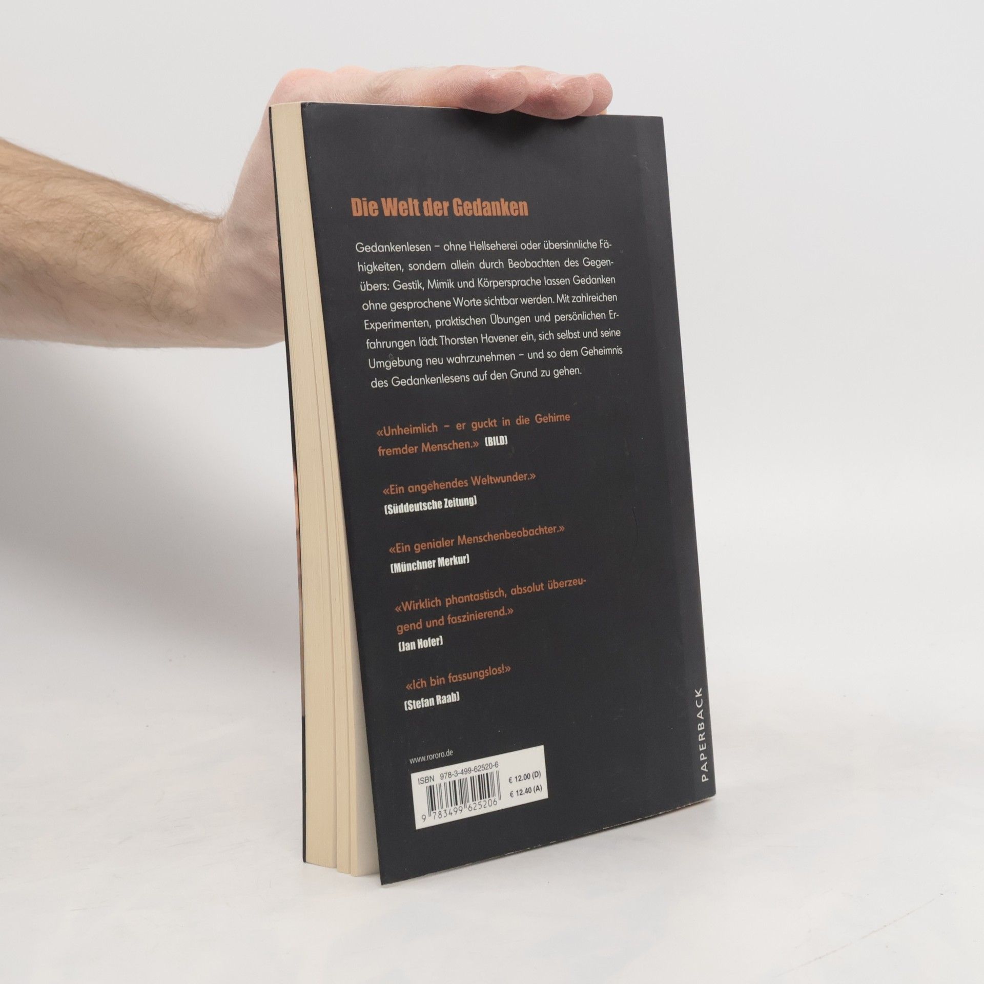Die Welt der Gedanken Gedankenlesen – ohne Hellseherei oder übersinnliche Fähigkeiten, sondern allein durch Beobachten des Gegenübers: Gestik, Mimik und Körpersprache lassen Gedanken ohne gesprochene Worte sichtbar werden. Mit zahlreichen Experimenten, praktischen Übungen und persönlichen Erfahrungen lädt Thorsten Havener ein, sich selbst und seine Umgebung neu wahrzunehmen – und so dem Geheimnis des Gedankenlesens auf den Grund zu gehen.