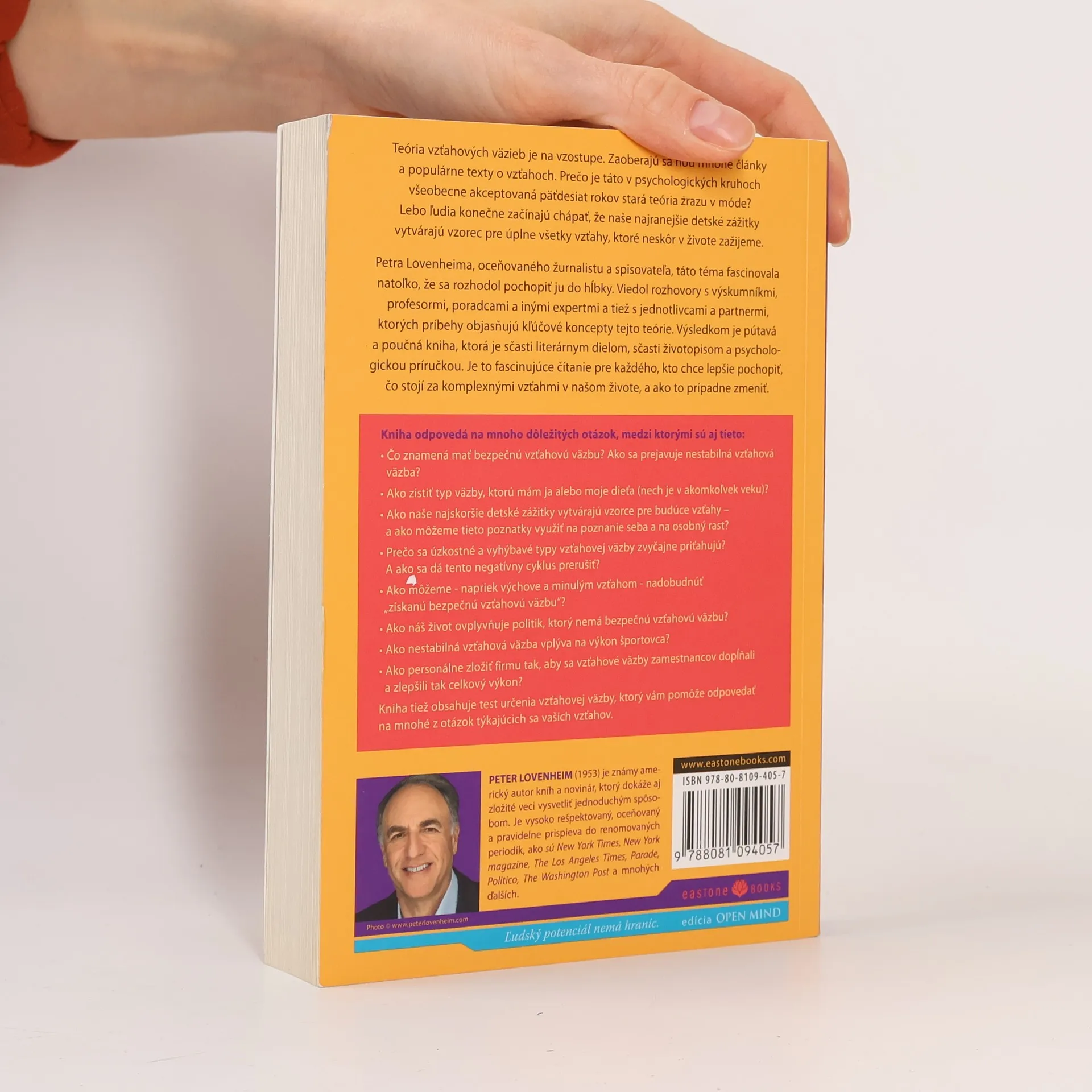 Teória vzťahových väzieb je na vzostupe. Zaoberajú sa ňou mnohé články a populárne texty o vzťahoch. Prečo je táto všeobecne akceptovaná päťdesiat rokov stará teória zrazu v móde? Lebo ľudia konečne začínajú chápať, že naše najrannejšie detské zážitky vytvárajú vzorec pre úplne všetky vzťahy, ktoré neskôr v živote zažijeme. Petra Lovenheima, oceňovaného žurnalistu a spisovateľa, táto téma fascinovala natoľko, že sa rozhodol pochopiť ju do hĺbky. Viedol rozhovory s výskumníkmi, profesormi, poradcami a inými expertmi a tiež jednotlivcami a partnermi, ktorých príbehy objasňujú kľúčové koncepty tejto teórie. Výsledkom je pútavá a poučná kniha, ktorá je sčasti literárnym dielom, sčasti životopisom a psychologickou príručkou. Je to fascinujúce čítanie pre každého, kto chce lepšie pochopiť, čo stojí za komplexnými vzťahmi v našom živote, a ako to prípadne zmeniť.