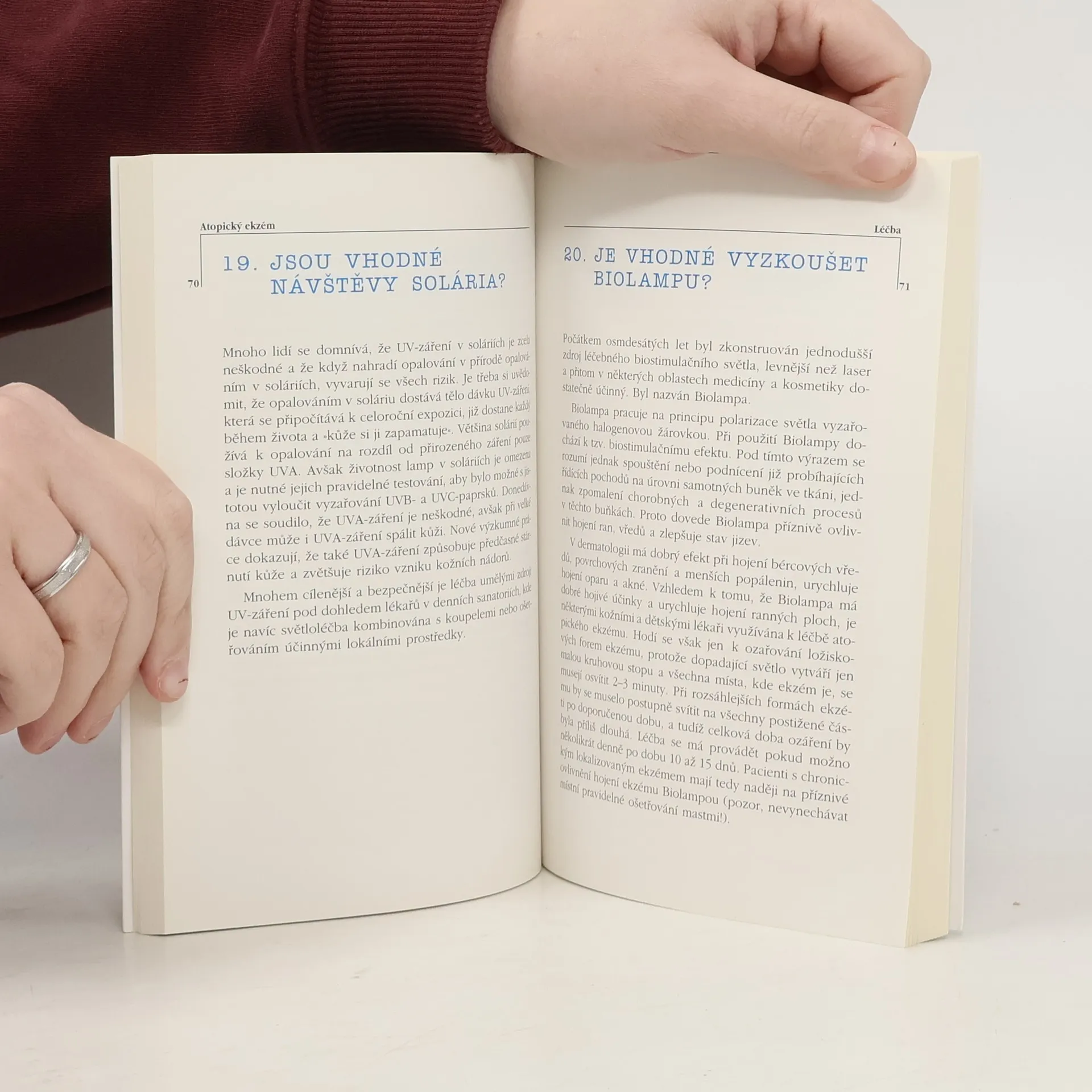 Formou otázek a odpovědí informují autoři o tom, co je atopický ekzém, jaké jsou jeho nejčastější příčiny a projevy, jaké jsou naděje na léčbu, čím je možné jeho projevy alespoň zmírnit. Praktické rady jsou zaměřeny především na vyváženou stravu bez alergenů, úpravu životosprávy a hygienu alergiků - ekzematiků. Za velmi užitečné považuji informace o používání dnes moderních a na trhu běžných kosmetických, léčebných či homeopatických prostředků, potravin pro alergiky, filtrů a čističek vzduchu apod., o jejichž významu pro léčbu se často objevují rozporné informace.