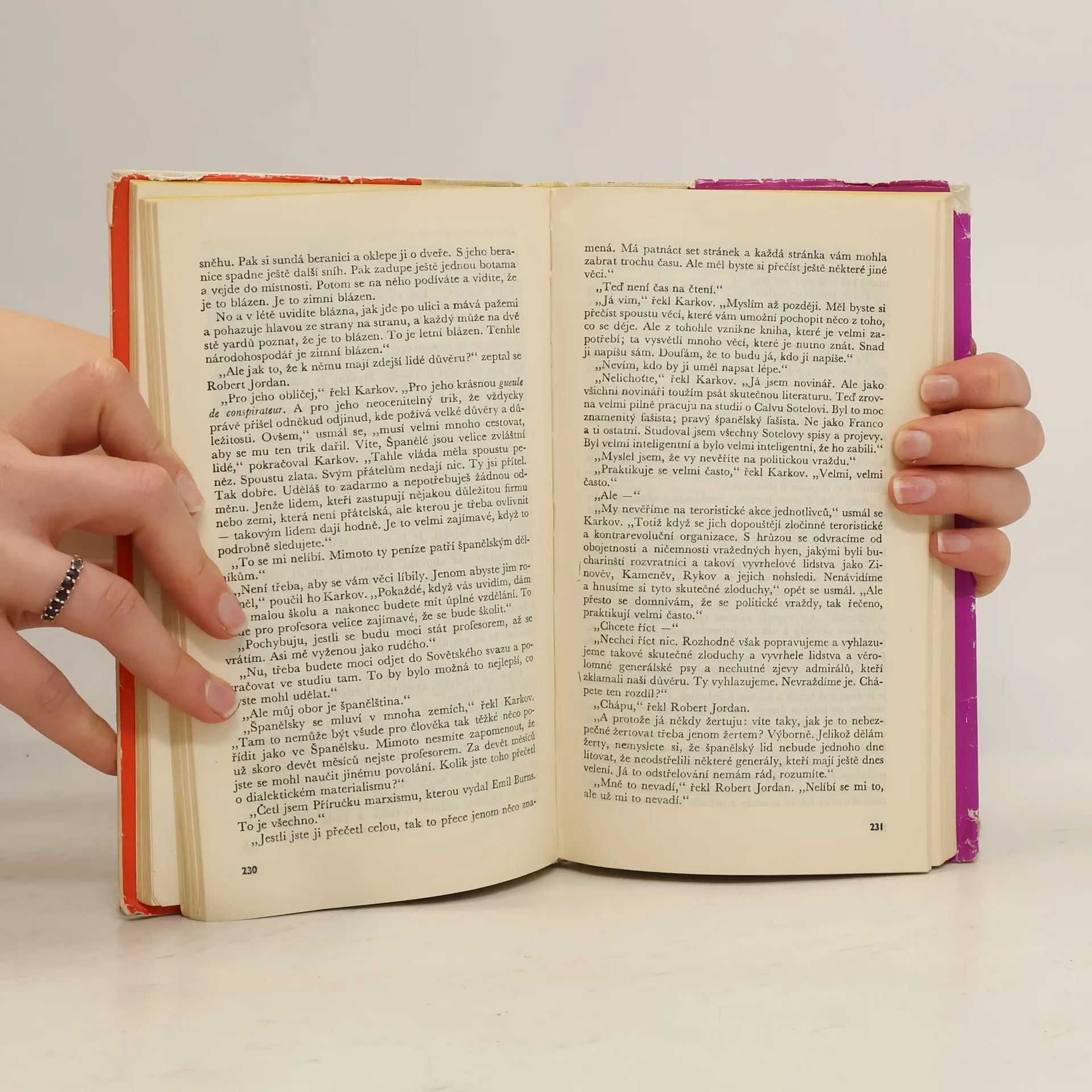 Od svého prvního setkání s autorem jsem měla obrovská očekávání. Doslova jsem čekala, že mě jeho styl a kniha posadí na zadek, ale nestalo se tak. Dialogy jsou velmi zvláštně napsané. Hemingway často dialogy opakuje klidně nekolikrát za sebou a to mi upřímně lezlo strašně na nervy. Stejně tak jako neustále se opakující jméno Robert Jordan. Robert Jordan udělal tohle, Robert Jordan udělal tamto. Bylo to velmi otravné. Moc tomu nepřispěly ani zdlouhavé a nudné filozofické myšlenky hlavní postavy. Celkově byl pro mě příběh dost o ničem, dokonce i ta romantická linka byla dost odtažitá, stejně jako zbytek knihy.