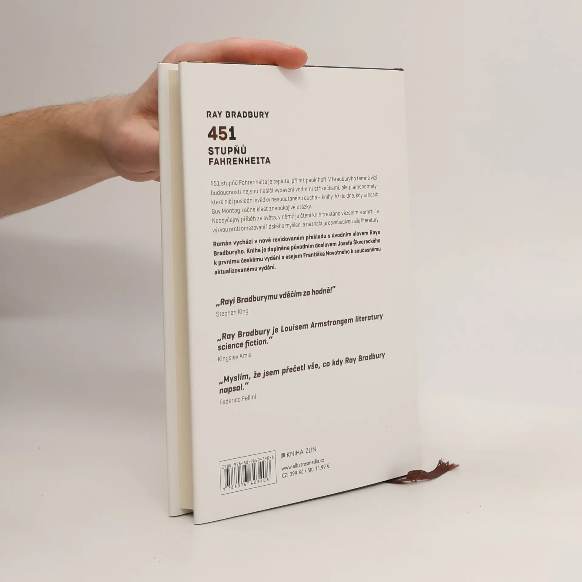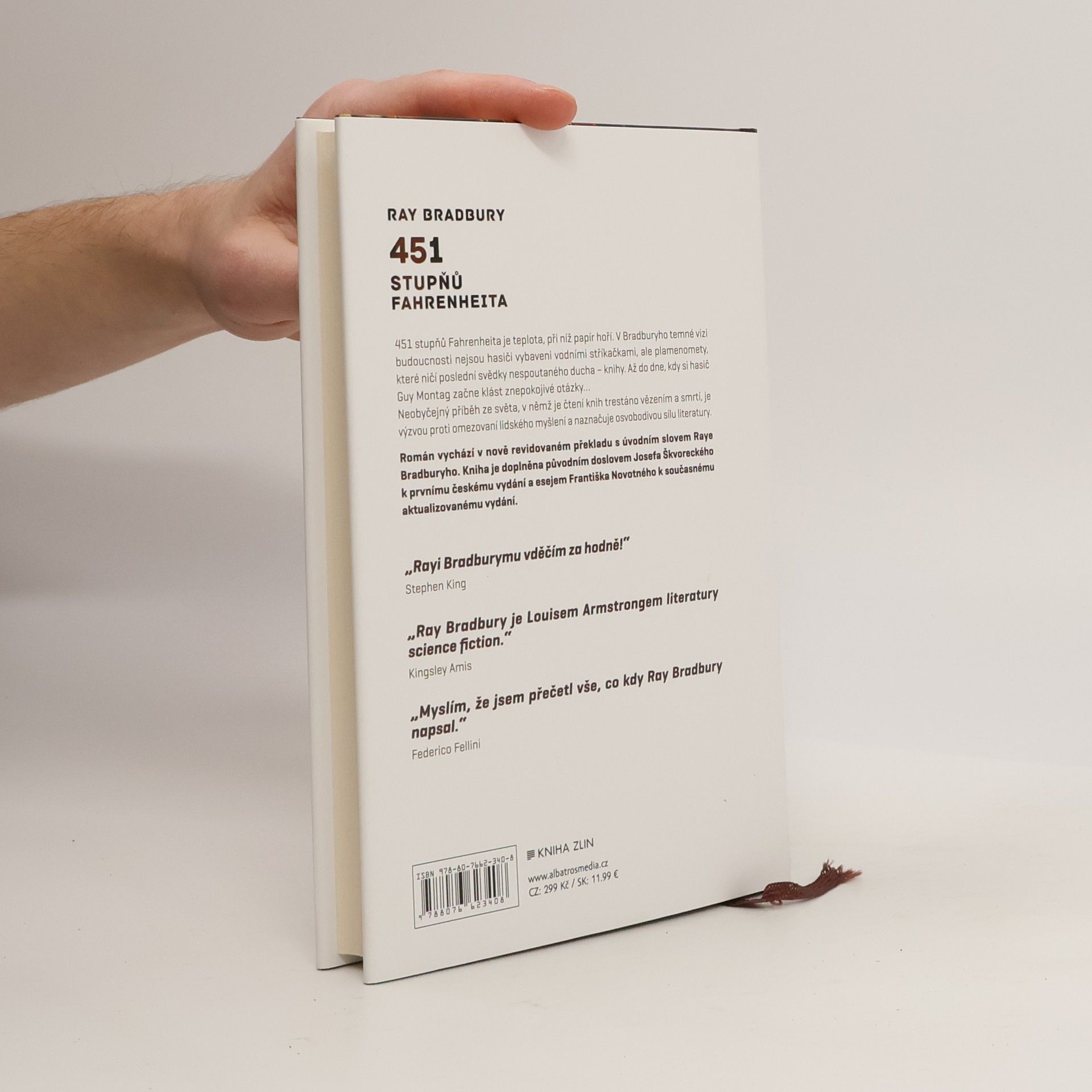 Nejslavnější dílo klasika science-fiction v novém překladu 451 stupňů Fahrenheita je teplota, při níž papír hoří. V Bradburyho temné vizi budoucnosti nejsou hasiči vybaveni vodními stříkačkami, ale plamenomety, které ničí poslední svědectví svobodného myšlení – knihy. Až do dne, kdy si hasič Guy Montag začne klást znepokojivé otázky… Román vychází v nově revidovaném překladu s úvodním slovem Raye Bradburyho. Kniha je doplněna původním doslovem Josefa Škvoreckého k prvnímu českému vydání a esejem Františka Novotného k současnému aktualizovanému vydání.