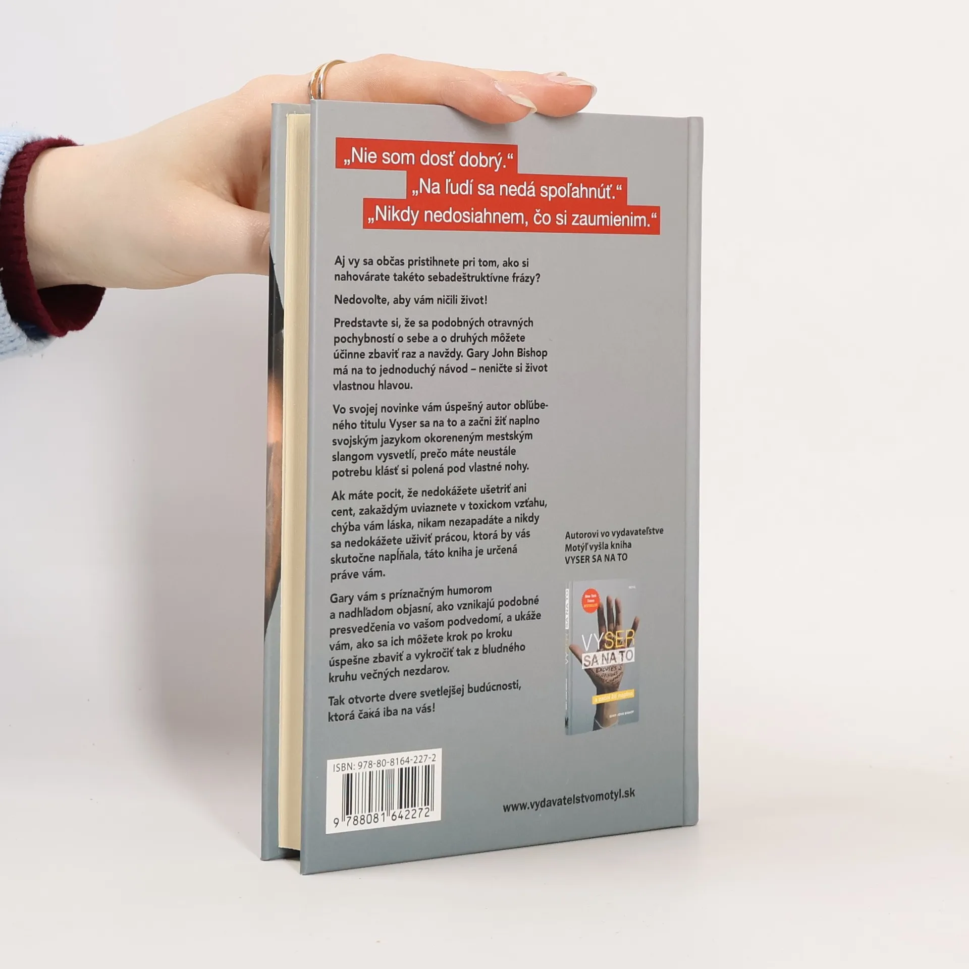 „Nie som dosť dobrý.“ „Na ľudí sa nedá spoľahnúť.“ „Nikdy nedosiahnem, čo si zaumienim.“ Aj vy sa občas pristihnete pri tom, ako si nahovárate takéto sebadeštruktívne frázy? Nedovoľte, aby vám ničili život! Predstavte si, že sa podobných otravných pochybností o sebe a o druhých môžete účinne zbaviť raz a navždy. Gary John Bishop má na to jednoduchý návod – neničte si život vlastnou hlavou. Vo svojej novinke vám úspešný autor obľúbeného titulu Vyser sa na to a začni žiť naplno svojským jazykom okoreneným mestským slangom vysvetlí, prečo máte neustále potrebu klásť si polená pod vlastné nohy. Ak máte pocit, že nedokážete ušetriť ani cent, zakaždým uviaznete v toxickom vzťahu, chýba vám láska, nikam nezapadáte a nikdy sa nedokážete uživiť prácou, ktorá by vás skutočne napĺňala, táto kniha je určená práve vám. Gary vám s príznačným humorom a nadhľadom objasní, ako vznikajú podobné presvedčenia vo vašom podvedomí, a ukáže vám, ako sa ich môžete krok po kroku úspešne zbaviť a vykročiť tak z bludného kruhu večných nezdarov.