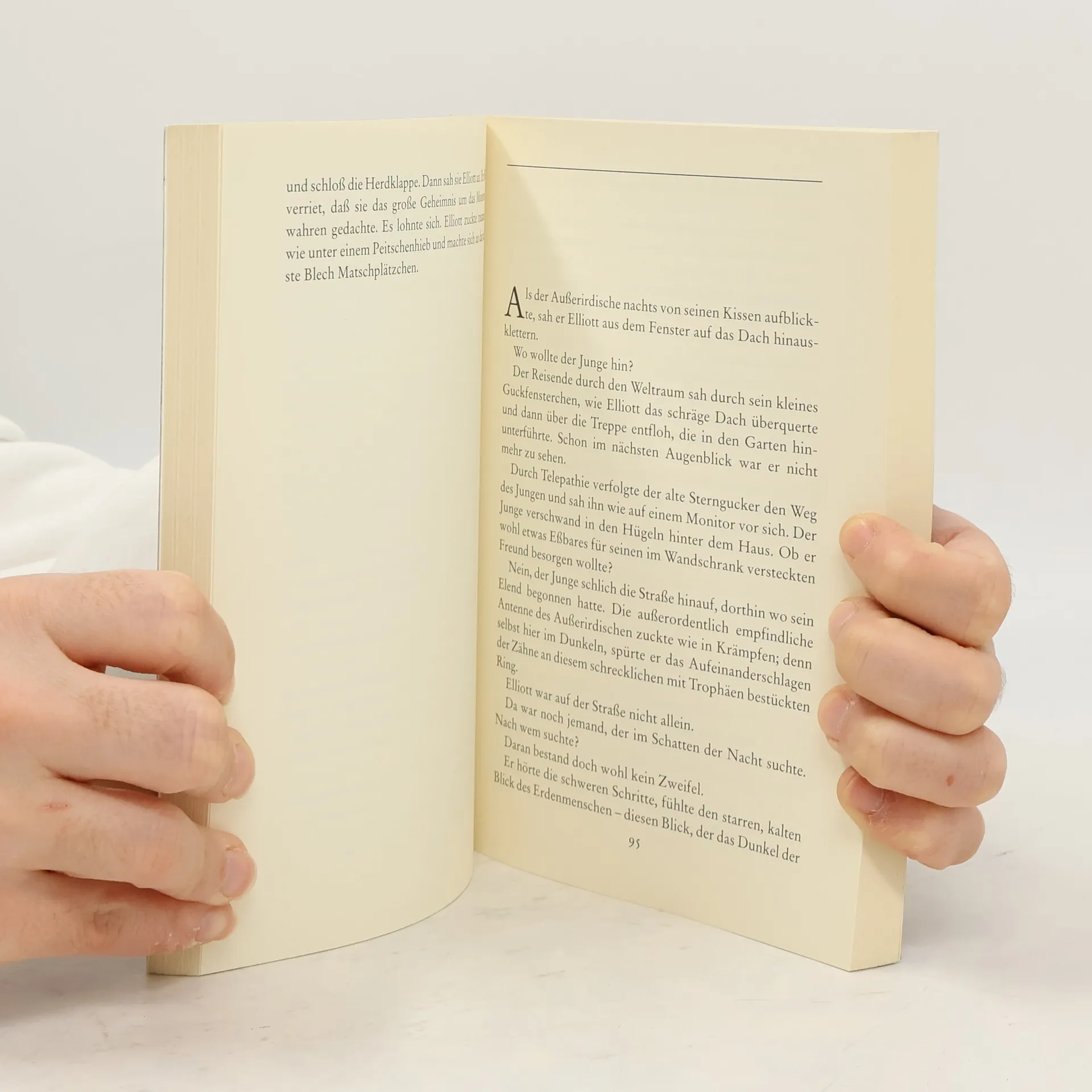 Er hat Angst. Er ist ganz allein - drei Millionen Lichtjahre von seinem Planeten entfernt. E.T., der Außerirdische, der sein Raumschiff verpaßte und nun auf Erden die seltsamsten Abenteuer erlebt. Aber E.T. kann in der feindlichen Umgebung nicht lange überleben. Unbekannte Gefahren lauern auf seinem Weg, hartnäckig verfolgen schreckliche Gestalten seine Spur. Eine dramatische Jagd gegen die Zeit beginnt... Doch dann findet Elliot, ein zehnjähriger Junge, den gehetzten, um sein Überleben kämpfenden Außerirdischen und nimmt ihn mit nach Hause...