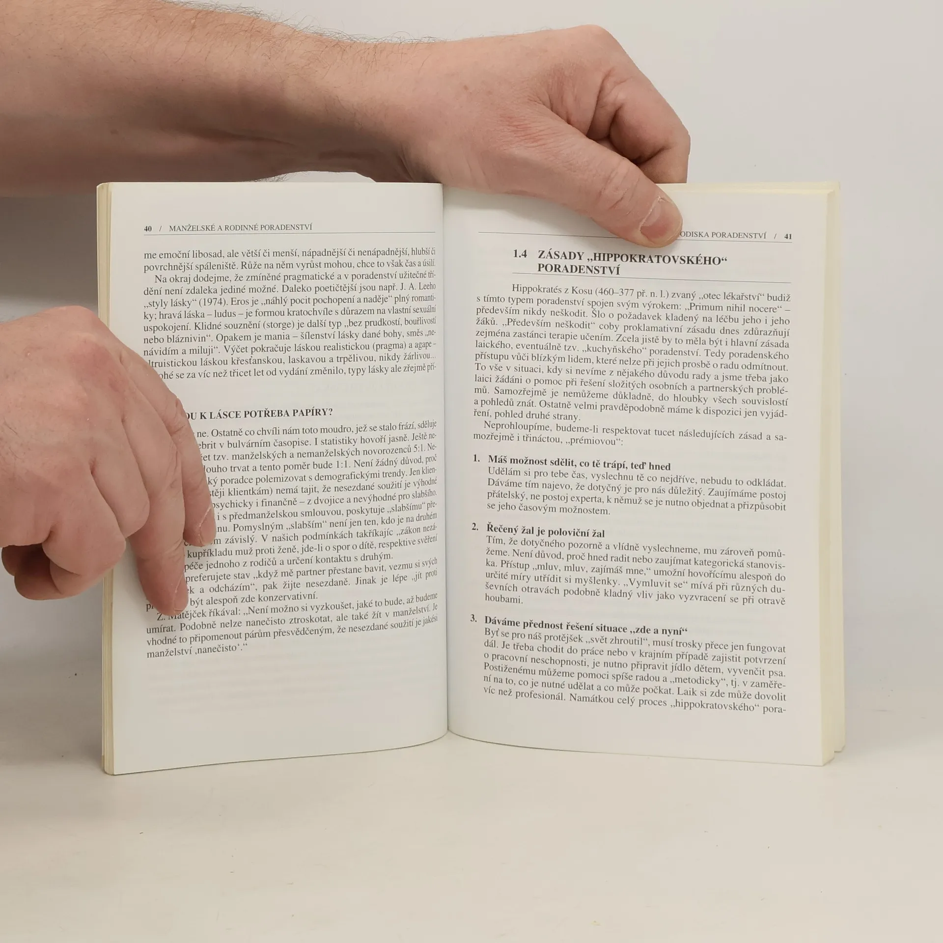 Příručka praktického manželského poradenství pro studenty psychologie, laiky i profesionály nabízí různé způsoby řešení poruch partnerského soužití. Renomovaný poradenský psycholog navrhuje v praxi fungující východiska z manželských krizí a neshod. Jde především o to, naučit se přiměřeným reakcím i jasné, asertivní komunikaci v páru i mezi všemi členy rodiny. Text se nejprve zabývá historií, technikou a taktikou poradenství včetně jeho zásad, z nichž nejdůležitější je dle autora: "Především neškodit". Další část vymezuje problémy manželského soužití a zaměřuje se zejména na možný manželský konflikt a jeho řešení v podmínkách omezeného časového prostoru. Mimořádnými, ale pro většinu krizových situací typickými událostmi, charakteristikou osob vyvolávajících konflikty a návodem "vlídně direktivního poradenství" se zabývá poslední třetina knihy. Nechybí dotazník poradenských problémů a seznam manželských poraden na území ČR.