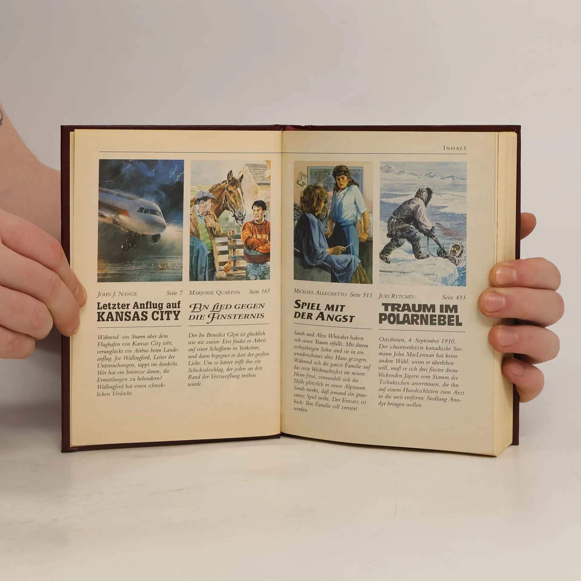 LETZTER ANFLUG AUF KANSAS CITY Während ein Sturm über dem Flughafen von Kansas City tobt, verunglückt ein Airbus beim Landeanflug. Joe Wallingford, Leiter der Untersuchungen, tappt im dunkeln. Wer hat Interesse daran, die Ermittlungen zu behindern? Wallingford hat einen schrecklichen Verdacht. EIN LIED GEGEN DIE FINSTERNIS Der Ire Benedict Glyn ist glücklich wie nie zuvor: Erst findet er Arbeit auf einer Schaffarm in Yorkshire, und dann begegnet er dort der großen Liebe. Um so härter trifft ihn ein Schicksalsschlag, der jeden an den Rand der Verzweiflung treiben würde. SPIEL MIT DER ANGST Sarah und Alex Whitaker haben sich einen Traum erfüllt. Mit ihrem sechsjährigen Sohn sind sie in ein wunderschönes altes Haus gezogen. Während sich die ganze Familie auf das erste Weihnachtsfest im neuen Heim freut, verwandelt sich die Idylle plötzlich in einen Alptraum. Sarah merkt, daß jemand ein grausames Spiel treibt. Der Einsatz ist hoch: Ihre Familie soll zerstört werden. TRAUM IM POLARNEBEL Ostsibirien, 4. September 1910. Der schwerverletzte kanadische Seemann John MacLennan hat keine andere Wahl: wenn er überleben will, muß er sich drei finster dreinblickenden Jägern vom Stamm der Tschuktschen anvertrauen, die ihn auf einem Hundeschlitten zum Arzt in die weit entfernte Siedlung Anadyr bringen wollen.
