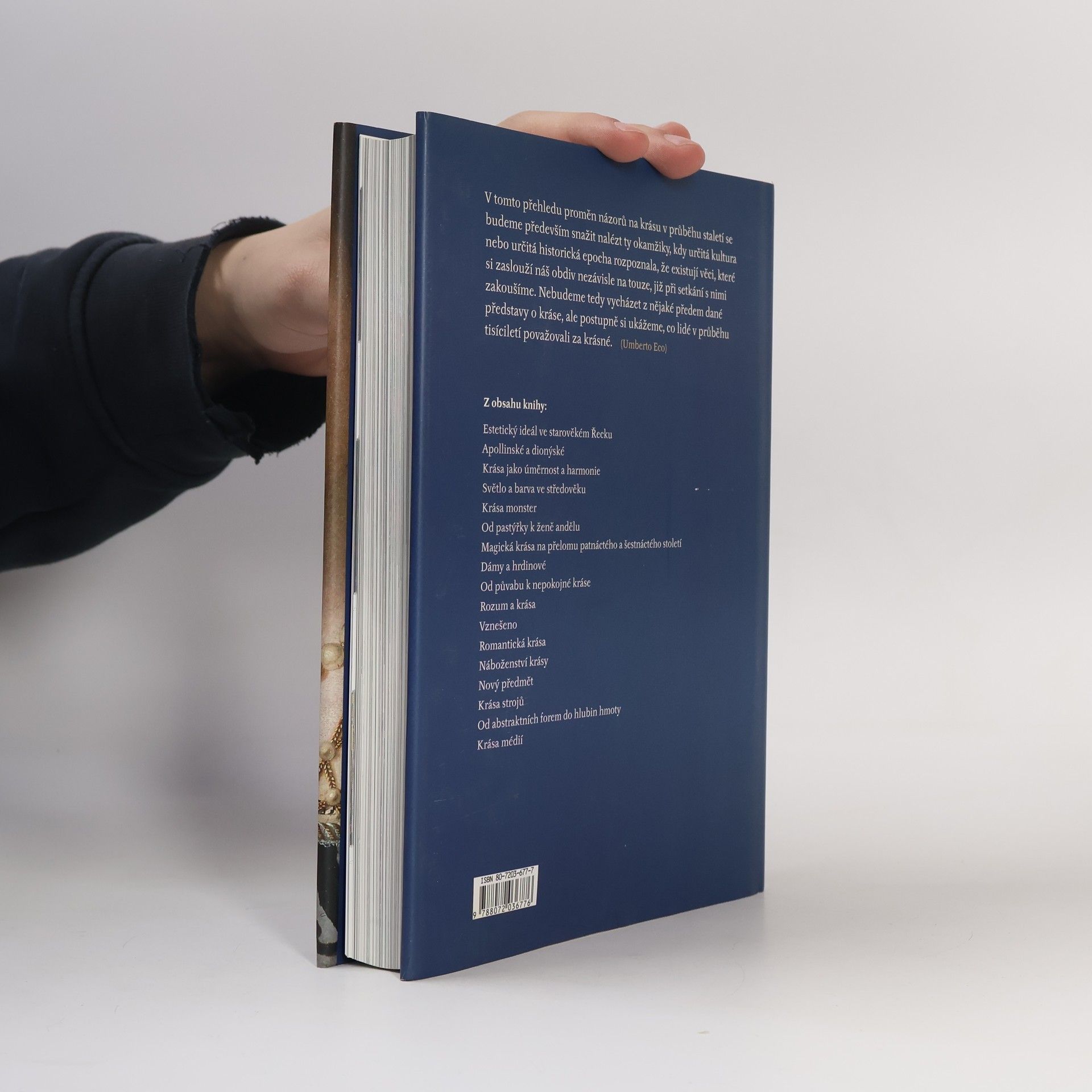 Na stránkách této knihy, jejímž editorem je Umberto Eco, najdeme obrazy mistrovských děl všech dob. Ilustrace i rozsáhlá antologie textů čtenáři přibližují rozmanité představy o kráse, jak se projevovaly od dob starého Řecka až dodnes.