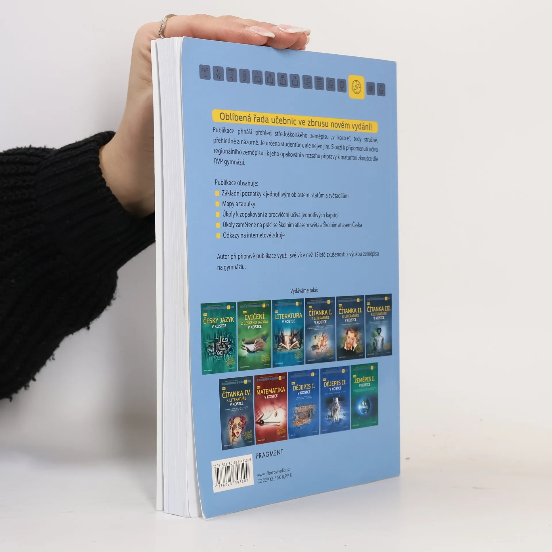 Publikace přináší přehled středoškolského zeměpisu „v kostce“, tedy stručně a přehledně. Slouží k připomenutí učiva obecného zeměpisu i k jeho opakování v rozsahu přípravy k maturitní zkoušce dle RVP gymnázií. Publikace obsahuje základní teorii z oblasti fyzické a socioekonomické geografie. Nechybí mapy, tabulky a schémata, soubory otázek k zopakování vybraného tématu či úlohy pro práci s mapou.