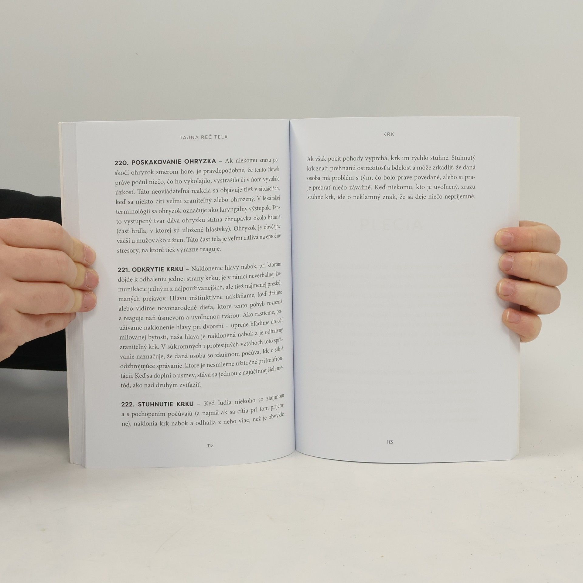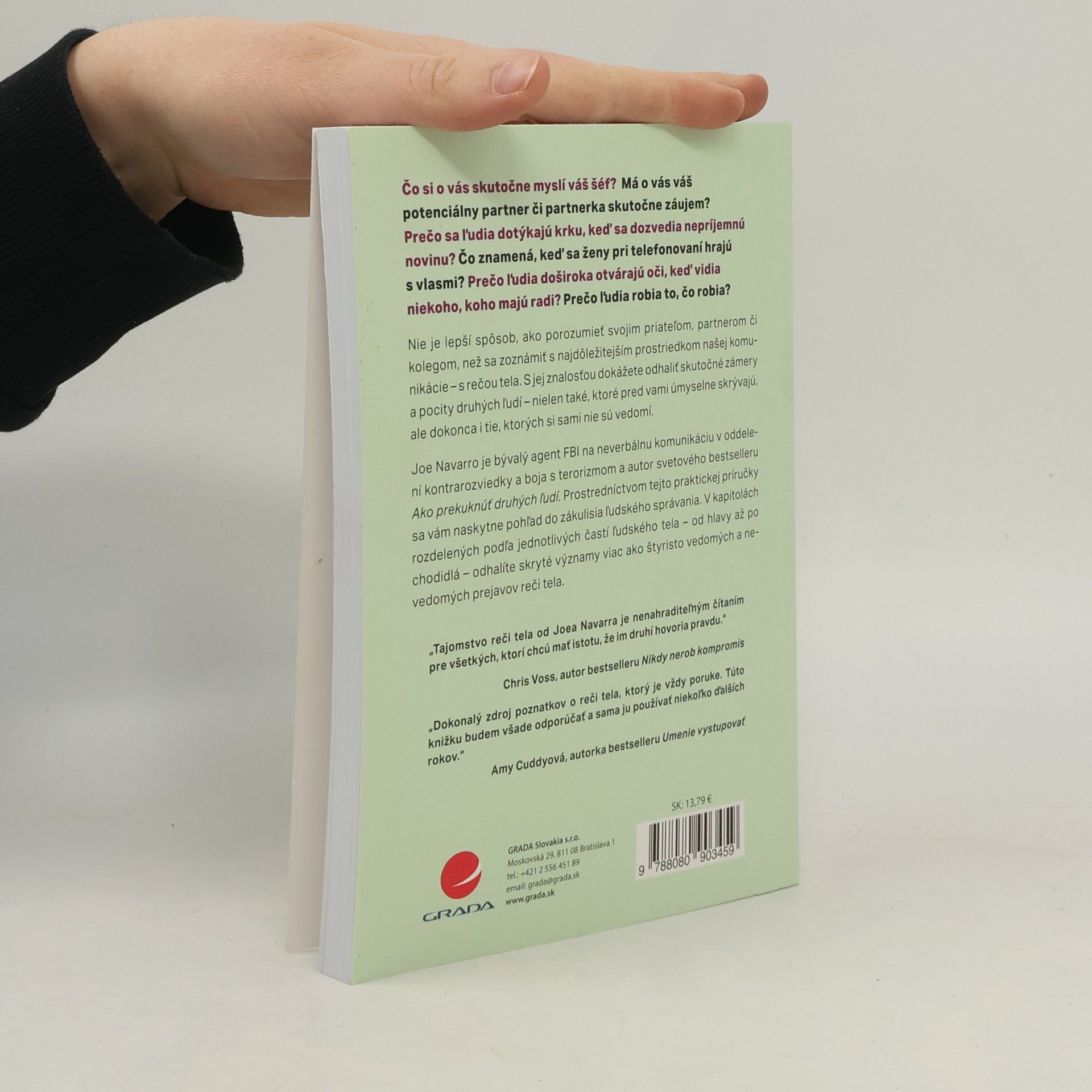 Čo si o vás skutočne myslí váš šéf? Má o vás váš potenciálny partner či partnerka skutočne záujem? Prečo sa ľudia dotýkajú krku, keď sa dozvedia nepríjemnú novinu? Čo znamená, keď sa ženy pri telefonovaní hrajú s vlasmi? Prečo ľudia doširoka otvárajú oči, keď vidia niekoho, koho majú radi? Prečo ľudia robia to, čo robia? Nie je lepší spôsob, ako porozumieť svojim priateľom, partnerom či kolegom, než sa zoznámiť s najdôležitejším prostriedkom našej komunikácie – s rečou tela. S jej znalosťou dokážete odhaliť skutočné zámery a pocity druhých ľudí – nielen také, ktoré pred vami úmyselne skrývajú, ale dokonca i tie, ktorých si sami nie sú vedomí. Joe Navarro je bývalý agent FBI na neverbálnu komunikáciu v oddelení kontrarozviedky a boja s terorizmom a autor svetového bestselleru Ako prekuknúť druhých ľudí. Prostredníctvom tejto praktickej príručky sa vám naskytne pohľad do zákulisia ľudského správania. V kapitolách rozdelených podľa jednotlivých častí ľudského tela – od hlavy až po chodidlá – odhalíte skryté významy viac ako štyristo vedomých a nevedomých prejavov reči tela.