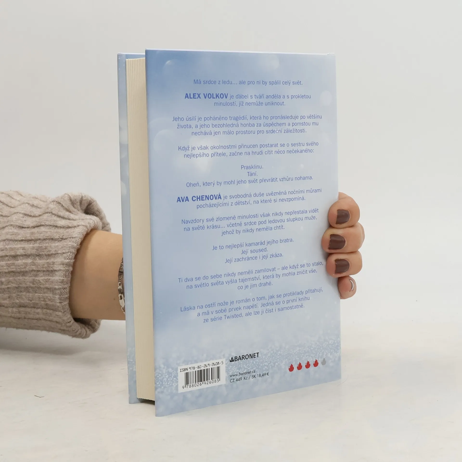 Má srdce z ledu... ale pro ni by spálil celý svět. Má srdce z ledu... ale pro ni by spálil celý svět. Alex Volkov je ďábel s tváří anděla a s prokletou minulostí, jíž nemůže uniknout. Jeho úsilí je poháněno tragédií, která ho pronásleduje po většinu života, a jeho bezohledná honba za úspěchem a pomstou mu nechává jen málo prostoru pro srdeční záležitosti. Když je však okolnostmi přinucen postarat se o sestru svého nejlepšího přítele, začne na hrudi cítit něco nečekaného: Prasklinu. Tání. Oheň, který by mohl jeho svět převrátit vzhůru nohama. Ava Chenová je svobodná duše uvězněná nočními můrami pocházejícími z dětství, na které si nevzpomíná. Navzdory své zlomené minulosti však nikdy nepřestala vidět na světě krásu... včetně srdce pod ledovou slupkou muže, jehož by nikdy neměla chtít. Je to nejlepší kamarád jejího bratra. Její soused. Její zachránce i její zkáza. Ti dva se do sebe nikdy neměli zamilovat – ale když se to stalo, na světlo světa vyšla tajemství, která by mohla zničit vše, co je jim drahé.