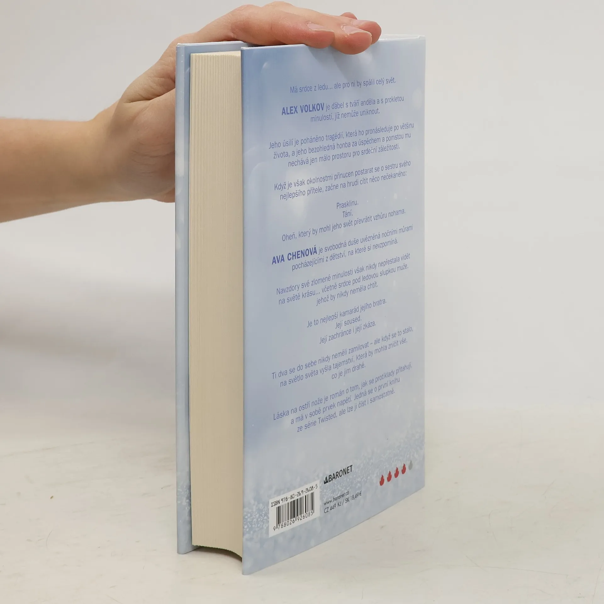 Má srdce z ledu... ale pro ni by spálil celý svět. Má srdce z ledu... ale pro ni by spálil celý svět. Alex Volkov je ďábel s tváří anděla a s prokletou minulostí, jíž nemůže uniknout. Jeho úsilí je poháněno tragédií, která ho pronásleduje po většinu života, a jeho bezohledná honba za úspěchem a pomstou mu nechává jen málo prostoru pro srdeční záležitosti. Když je však okolnostmi přinucen postarat se o sestru svého nejlepšího přítele, začne na hrudi cítit něco nečekaného: Prasklinu. Tání. Oheň, který by mohl jeho svět převrátit vzhůru nohama. Ava Chenová je svobodná duše uvězněná nočními můrami pocházejícími z dětství, na které si nevzpomíná. Navzdory své zlomené minulosti však nikdy nepřestala vidět na světě krásu... včetně srdce pod ledovou slupkou muže, jehož by nikdy neměla chtít. Je to nejlepší kamarád jejího bratra. Její soused. Její zachránce i její zkáza. Ti dva se do sebe nikdy neměli zamilovat – ale když se to stalo, na světlo světa vyšla tajemství, která by mohla zničit vše, co je jim drahé.