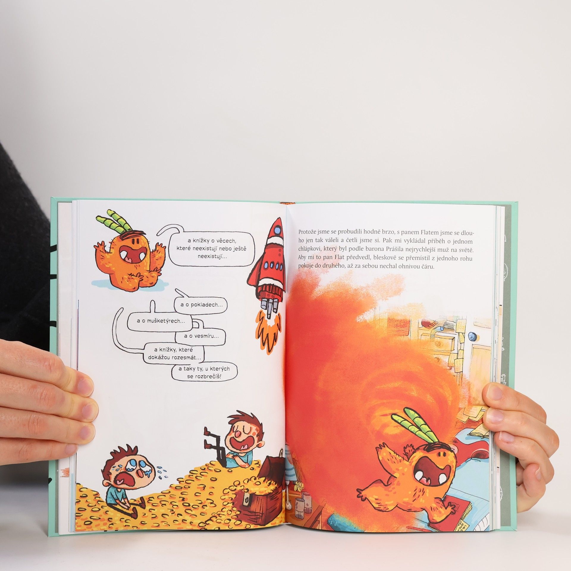 První díl bláznivě ztřeštěné série plné příšerek. Nazdárek! Já jsem Agus Pianola. Tys to netušil, ale my dva jsme se jednou museli poznat! Ještě nedávno jsem byl celkem normální kluk: chodil jsem do školy, ztrácel slohovky, hltal pizzy… Ale pak jsem poznal pana Flata a všechno se změnilo. Ty vlastně ještě nevíš, kdo je pan Flat, že jo? Prozradím ti jedině to, že je to příšerka a že od té doby, co se zabydlel v mém pokoji, je svět nejen zábavnější, ale i lepší. Rozhodně lepší, i když teda samý průšvih! O mně a o dalších příšerkách (jo, bude jich víc!) si přečti sám. A jestli se bojíš čtení jako já, mám pro tebe dobrou zprávu. Tahle knížka je plná obrázků a komiksových bublin. To by šlo, ne?