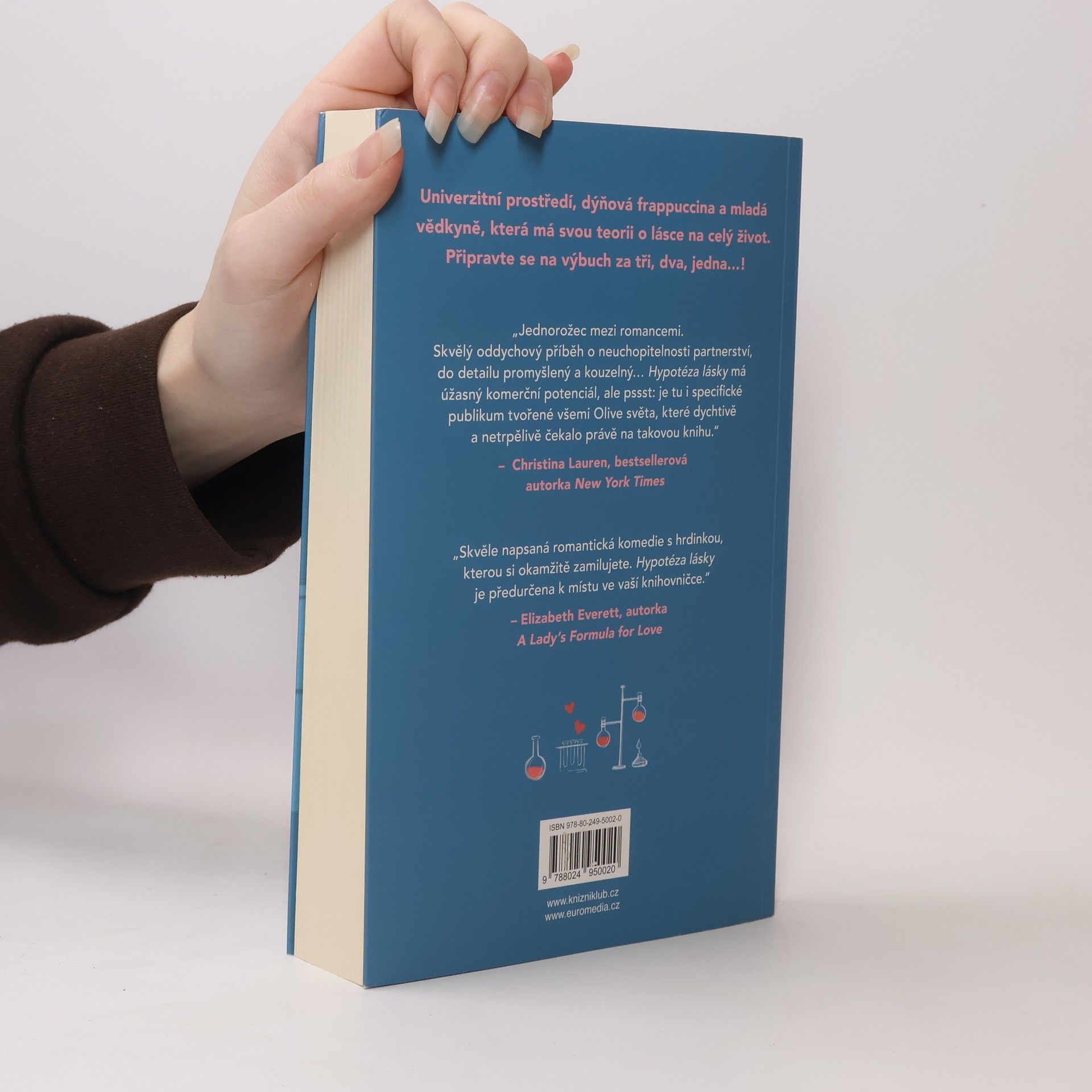 Romantická komedie, která zbořila sociální sítě! Olive je doktorandka na Stanfordu. Na trvalé romantické vztahy příliš nevěří, zato její nejlepší kamarádka ano. Takže pokud ji chce přesvědčit, že s někým randí a její milostný život nabral správný směr, musí na to jít chytře. Vědci totiž potřebují důkazy. Proto Olive, jako každá jiná sebevědomá bioložka, zpanikaří a políbí prvního muže, na kterého narazí – Adama Carlsena. Mladý, v oboru uznávaný profesor má pověst přísného školitele. Byl tak jejich polibek největší chybou, kterou Olive v životě udělala, nebo se tohle setkání může vyvinout v něco víc? Kniha obsahuje také bonusovou kapitolu.