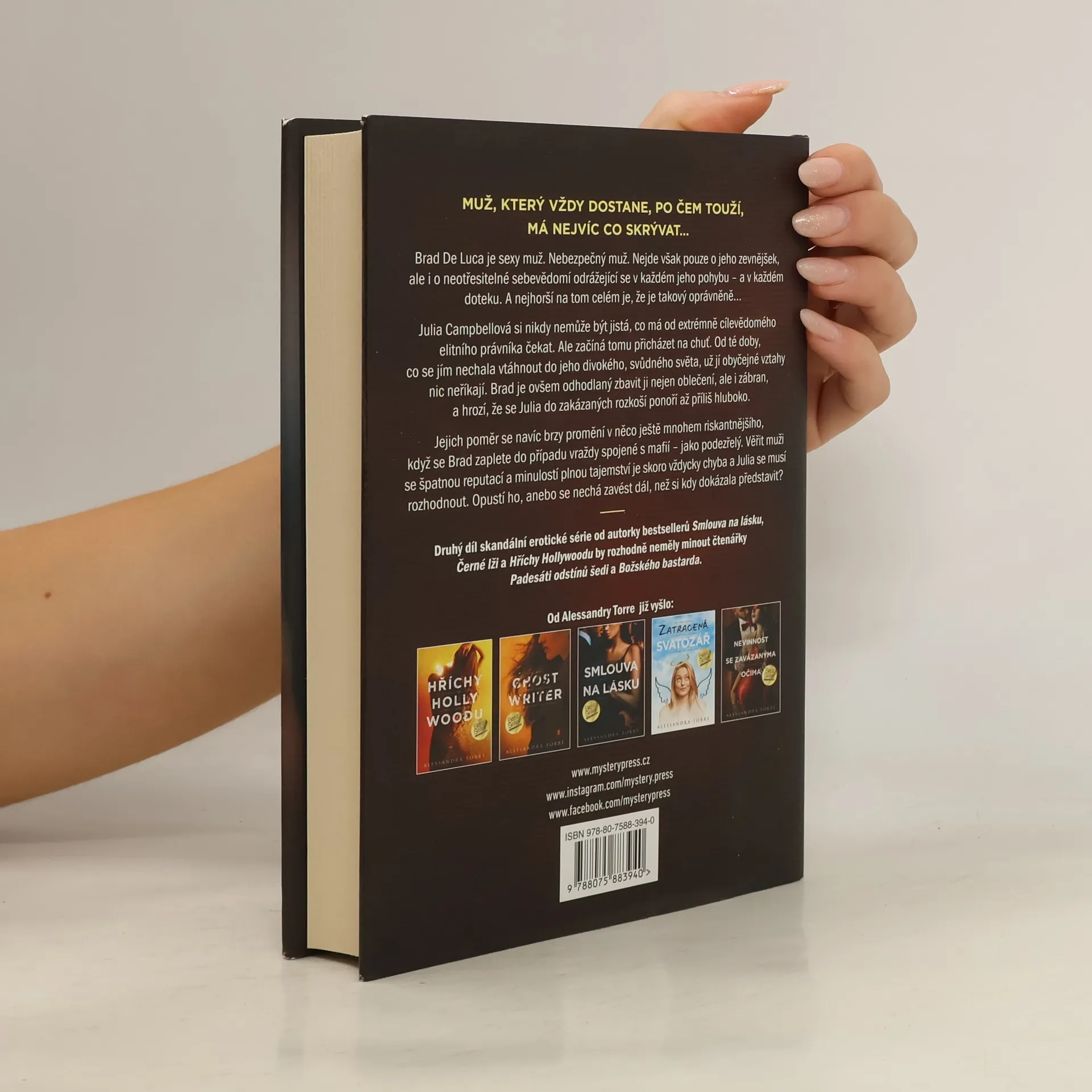 MUŽ, KTERÝ VŽDY DOSTANE, PO ČEM TOUŽÍ, MÁ NEJVÍC CO SKRÝVAT…Brad De Luca je sexy muž. Nebezpečný muž. Nejde však pouze o jeho zevnějšek, ale i o neotřesitelné sebevědomí odrážející se v každém jeho pohybu – a v každém doteku. A nejhorší na tom celém je, že je takový oprávněně…Julia Campbellová si nikdy nemůže být jistá, co má od extrémně cílevědomého elitního právníka čekat. Ale začíná tomu přicházet na chuť. Od té doby, co se jím nechala vtáhnout do jeho divokého, svůdného světa, už jí obyčejné vztahy nic neříkají. Brad je ovšem odhodlaný zbavit ji nejen oblečení, ale i zábran, a hrozí, že se Julia do zakázaných rozkoší ponoří až příliš hluboko.Jejich poměr se navíc brzy promění v něco ještě mnohem riskantnějšího, když se Brad zaplete do případu vraždy spojené s mafií – jako podezřelý. Věřit muži se špatnou reputací a minulostí plnou tajemství je skoro vždycky chyba a Julia se musí rozhodnout. Opustí ho, anebo se nechá zavést dál, než si kdy dokázala představit?___Druhý díl skandální erotické série od autorky bestsellerů Smlouva na lásku, Černé lži a Hříchy Hollywoodu by rozhodně neměly minout čtenářky Padesáti odstínů šedi a Božského bastarda.