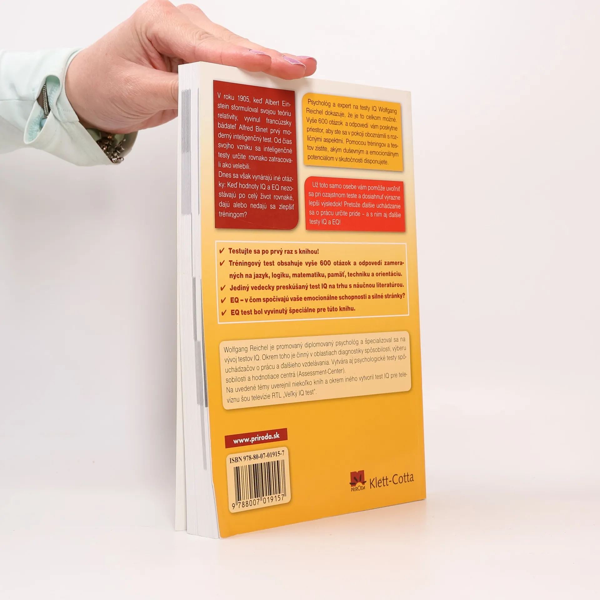 V roku 1905, keď Albert Einstein sformuloval svojou teóriu relativity, vyvinul francúzsky bádateľ Alfred Binet prvý moderný inteligenčný test. Od čias svojho vzniku sa inteligenčné testy určite rovnako zatracovali ako velebili. Dnes sa však vynárajú iné otázky: Keď hodnoty IQ a EQ nezostávajú po celý život rovnaké, dajú alebo nedajú sa zlepšiť tréningom? Psychológ a expert na testy IQ Wolfgang Reichel dokazuje, že je to celkom možné. Vyše 600 otázok a odpovedí vám poskytne priestor, aby ste sa v pokoji oboznámili s rozličnými aspektmi. Pomocou tréningov a testov zistíte, akým duševným a emocionálnym potenciálom v skutočnosti disponujete.