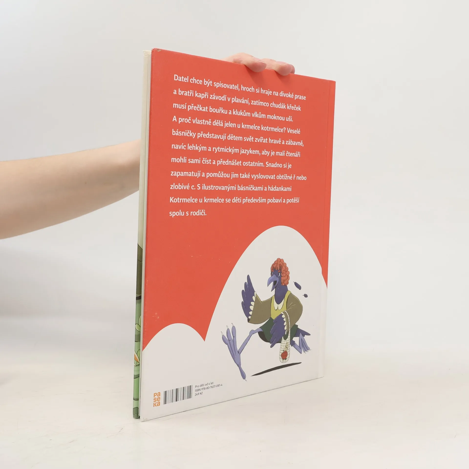 Datel chce být spisovatel, hroch si hraje na divoké prase a bratři kapři závodí v plavání, zatímco chudák křeček musí přečkat bouřku a klukům vlkům moknou uši. A proč vlastně dělá jelen u krmelce kotrmelce? Veselé básničky představují dětem svět zvířat hravě a zábavně, navíc lehkým a rytmickým jazykem, aby je malí čtenáři mohli sami číst a přednášet ostatním. Snadno si je zapamatují a pomůžou jim také vyslovovat obtížné ř nebo zlobivé c. S ilustrovanými básničkami a hádankami Kotrmelce u krmelce se děti především pobaví a potěší spolu s rodiči.