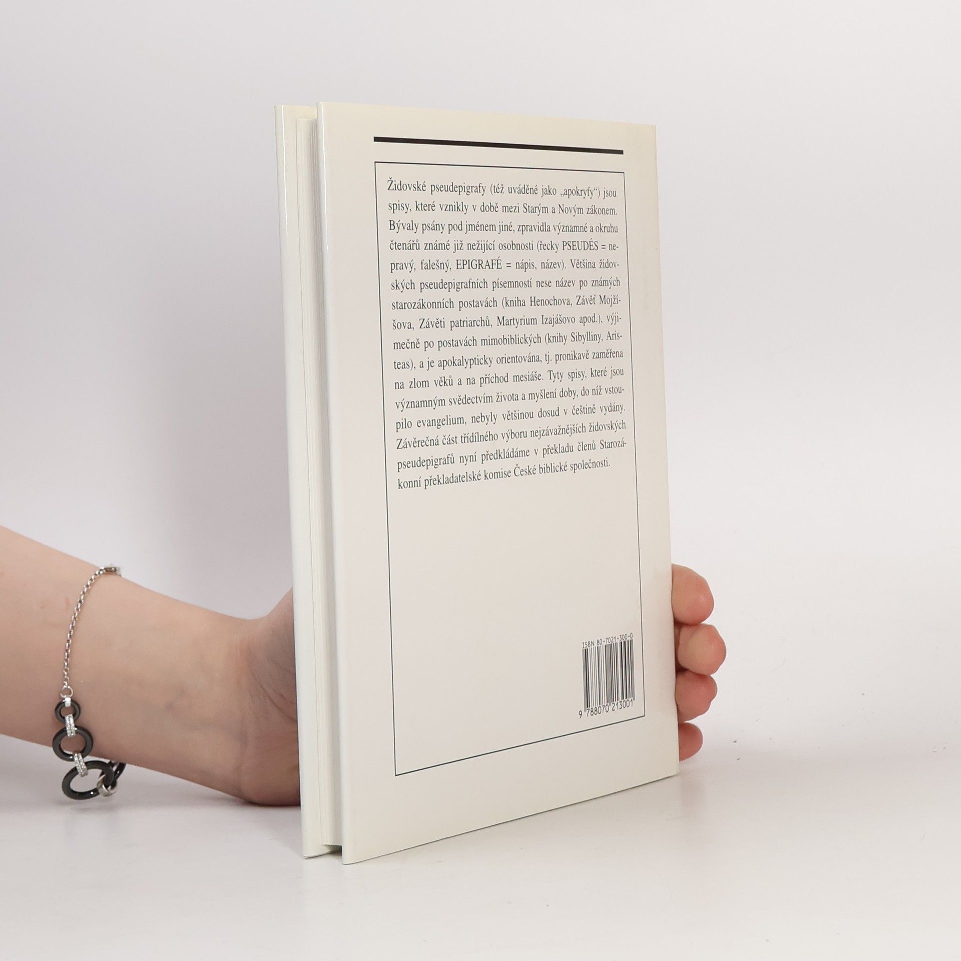 Mimobiblické židovské spisy - pseudepigrafy jsou spisy, které vznikly v době mezi Starým a Novým zákonem. Tato kniha obsahuje tyto: 3. Kniha Makabejská, 4. Kniha Makabejská, Zjevení Abrahamovo, Závěť Abrahamova, Nanebevzetí Mojžíšovo, Modlitba Menašeho, Ódy Šalomounovy, Syrské žalmy, Josefa Asenat