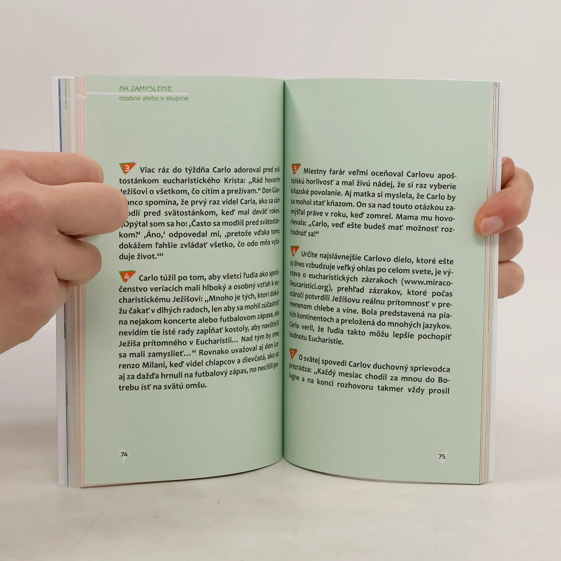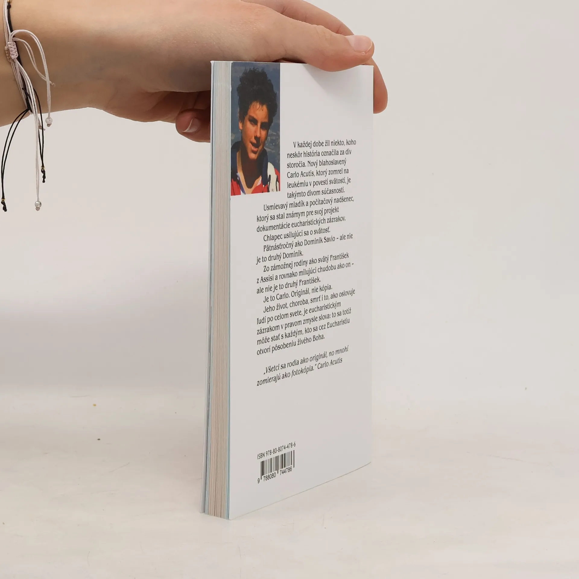 Krátky a svieži životopis nového blahoslaveného, ktorý ako pätnásťročný zomrel na leukémiu v povesti svätosti. V každej dobe žil niekto, koho neskôr história označila za div storočia. Nový blahoslavený Carlo Acutis je takýmto divom súčasnosti. Usmievavý mladík a počítačový nadšenec, ktorý sa stal známym pre svoj projekt dokumentácie eucharistických zázrakov. Chlapec usilujúci sa o svätosť. Pätnásťročný ako Dominik Savio – ale nie je to druhý Dominik. Zo zámožnej rodiny ako svätý František z Assisi a rovnako milujúci chudobu ako on – ale nie je to druhý František. Je to Carlo. Originál, nie kópia. Jeho život, choroba, smrť i to, ako oslovuje ľudí po celom svete, je eucharistickým zázrakom v pravom zmysle slova: to sa totiž môže stať s každým, kto sa cez Eucharistiu otvorí pôsobeniu živého Boha. Kniha je adresovaná dospievajúcim, ktorí sa môžu inšpirovať nevšedným kresťanským životom tohto mladého chlapca. Na konci každej kapitoly sú podnety na osobné zamyslenie alebo na prácu v mládežníckych skupinách.