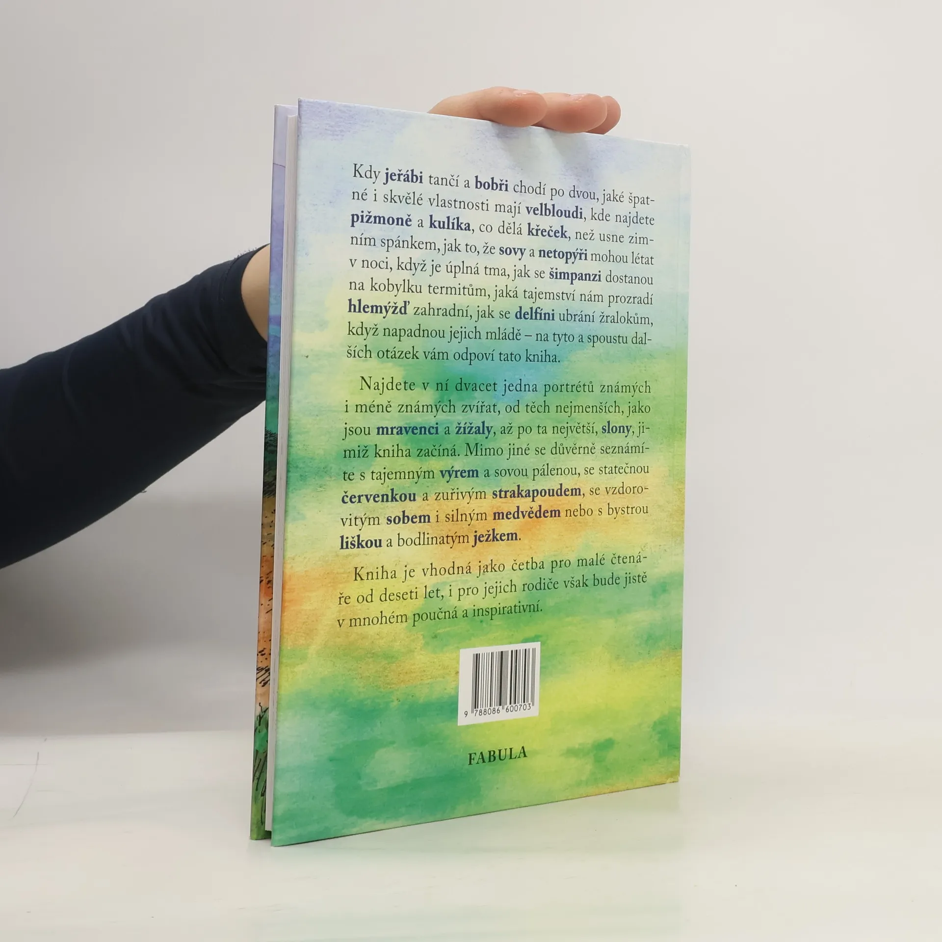 Kniha vám prozradí tajemství různých zvířat - jak to, že sovy a netopýři mohou létat v noci, co dělá křeček, když usne zimním spánkem, kde hledat pižmoně a kulíka, najdete v ní dvacet jedna portrétů známých i méně známých zvířat, od těch nejmenších, jako jsou mravenci a žížaly, až po ta největší, slony, jimiž kniha začíná. Také se důvěrně seznámíte s tajemným výrem a sovou pálenou, statečnou červenkou a zuřivým strakapoudem, se vzdorovitým, sobem i silným medvědem nebo bystrou liškou a bodlinatým ježkem. Kniha je vhodná jako četba pro malé čtenáře od deseti let, i pro rodiče a učitele však bude jistě v mnohém poučná i inspirativní.