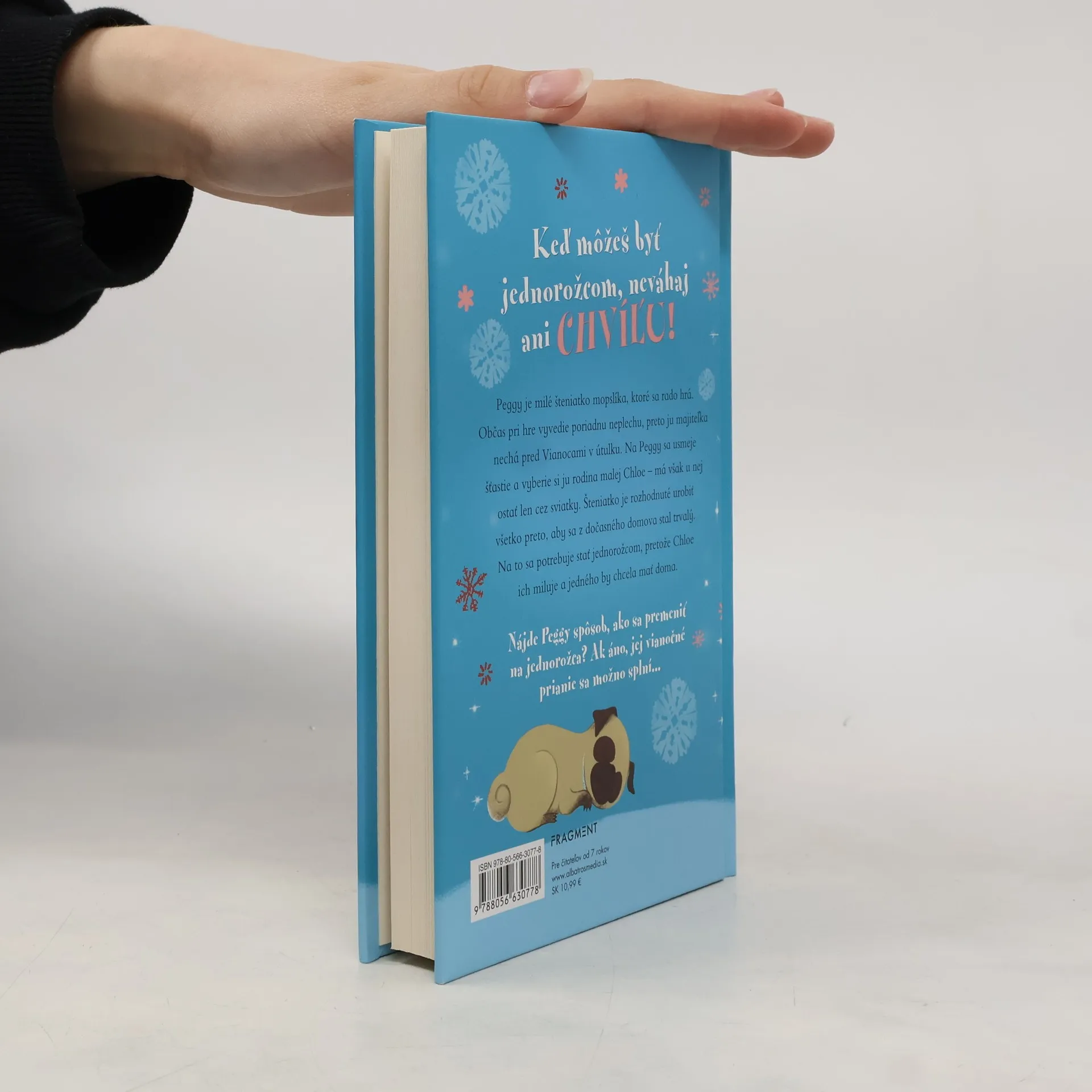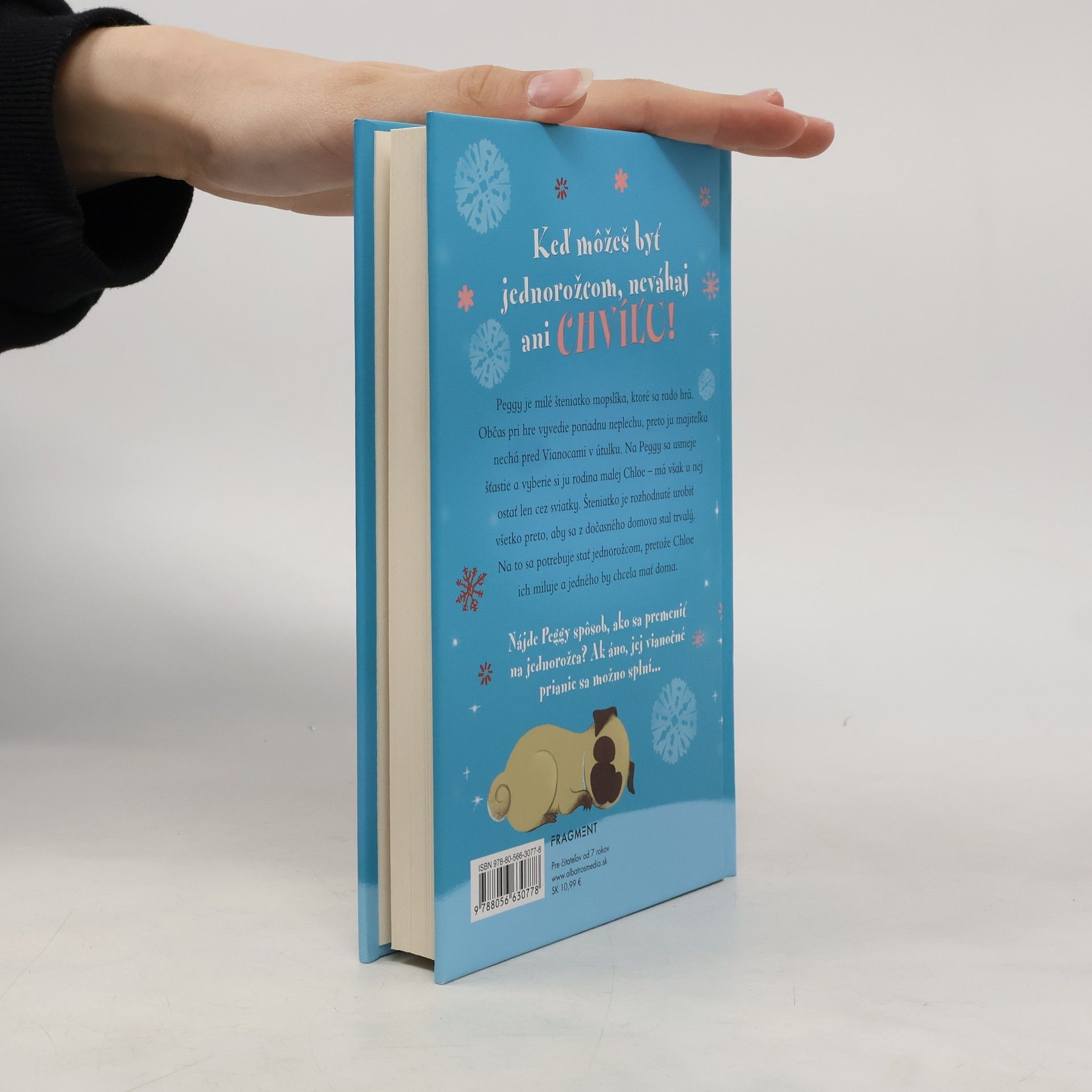 Keď môžeš byť jednorožcom, neváhaj ani chvíľu!Peggy je milé šteniatko mopslíka, ktoré sa rado hrá. Občas pri hre vyvedie poriadnu neplechu, preto ju majiteľka nechá pred Vianocami v útulku. Na Peggy sa usmeje šťastie a vyberie si ju rodina malej Chloe – má však u nej ostať len cez sviatky. Šteniatko je rozhodnuté urobiť všetko preto, aby sa z dočasného domova stal trvalý. Na to sa potrebuje stať jednorožcom, pretože Chloe ich miluje a jedného by chcela mať doma.Nájde Peggy spôsob, ako sa premeniť na jednorožca? Ak áno, jej vianočné prianie sa možno splní...