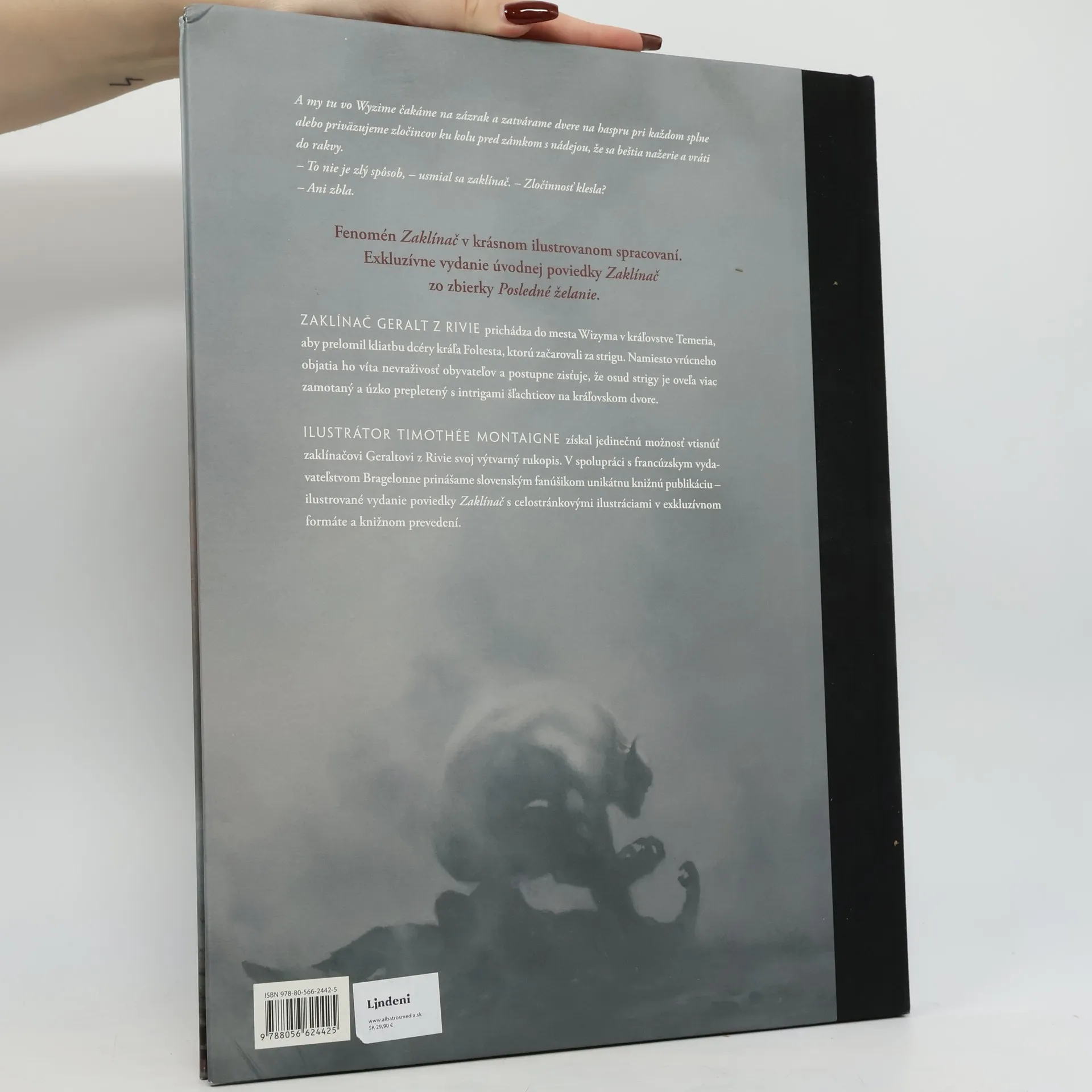 Exkluzívne vydanie poviedky Zaklínač. Fenomén Zaklínač v krásnom ilustrovanom spracovaní. Ilustrátor Timothée Montaigne získal jedinečnú možnosť vtisnúť zaklínačovi Geraltovi z Rivie svoj výtvarný rukopis. V spolupráci s francúzskym vydavateľstvom Bragelonne vydavateľstvo Lindeni prináša slovenským fanúšikom unikátnu knižnú publikáciu – ilustrované vydanie poviedky Zaklínač s celostránkovými ilustráciami v exkluzívnom formáte a knižnom prevedení.