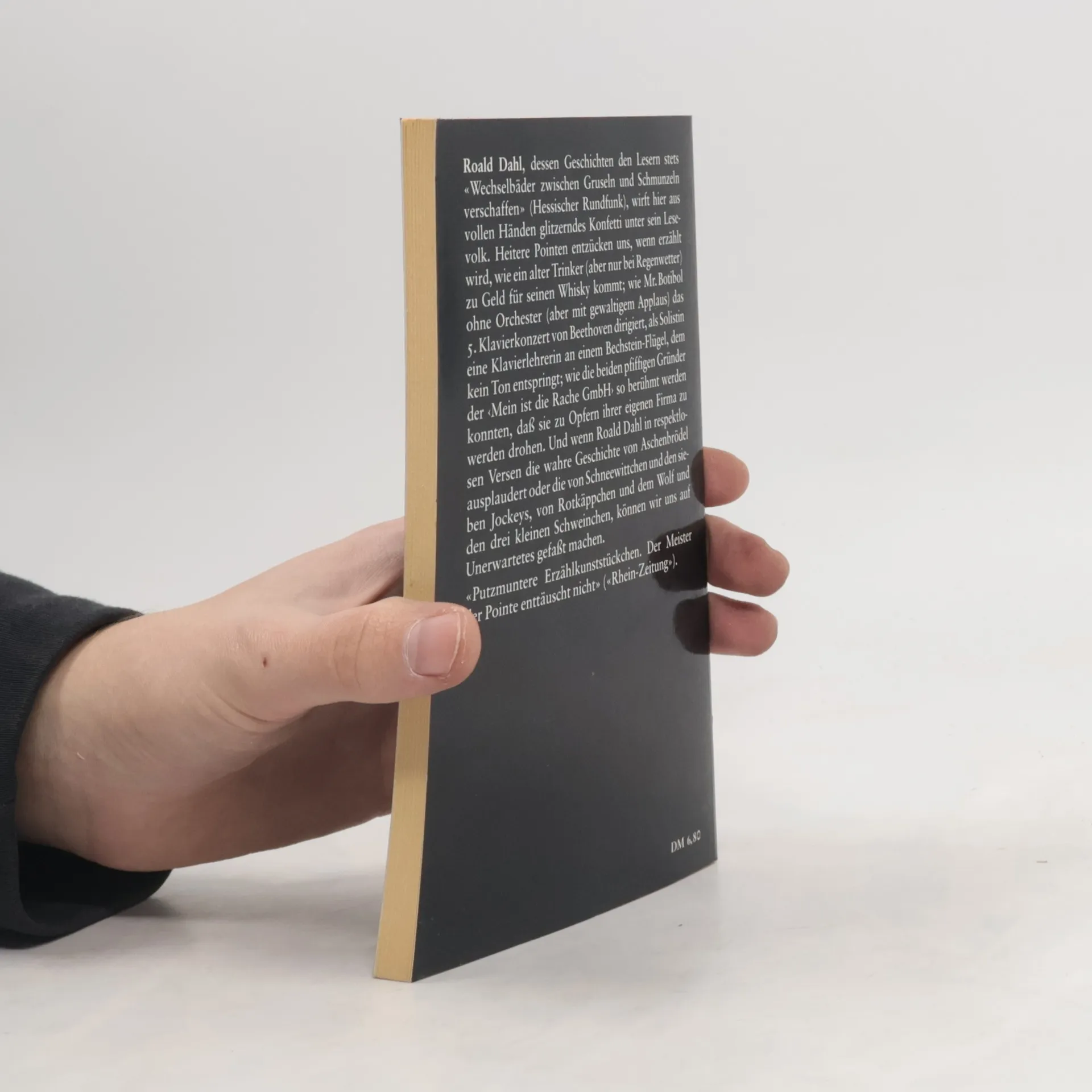 Roald Dahl, dessen Geschichten den Lesern stets „Wechselbäder zwischen Gruseln und Schmunzeln verschaffen“ (Hessischer Rundfunk), wirft hier aus vollen Händen glitzerndes Konfetti unter sein Leservolk. Heitere Pointen entzücken uns, wenn erzählt wird, wie ein alter Trinker (aber nur bei Regenwetter) zu Geld für seinen Whisky kommt; wie Mr. Botibol ohne Orchester (aber mit gewaltigem Applaus) das 5. Klavierkonzert von Beethoven als Solistin eine Klavierlehrerin an einem Bechstein-Flügel, dem kein Ton entspringt; wie die beiden pfiffigen Gründer der „Mein ist die Rache GmbH“ so berühmt werden konnten, daß sie zu Opfern ihrer eigenen Firma zu werden drohen. Und wenn Roald Dahl in respektlosen Versen die wahre Geschichte von Aschenbrödel ausplaudert oder die von Schneewittchen und den sieben Jockeys, von Rotkäppchen und dem Wolf und den drei kleinen Schweinchen, können wir uns auf Unerwartetes gefasst machen.